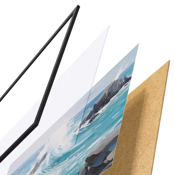 De poster bestaat uit een frame, plexiglas, geprinte afbeelding en spaanplaat achterkant. De poster kan meteen aan de muur worden gehangen dankzij de bevestigingen op de achterkant.