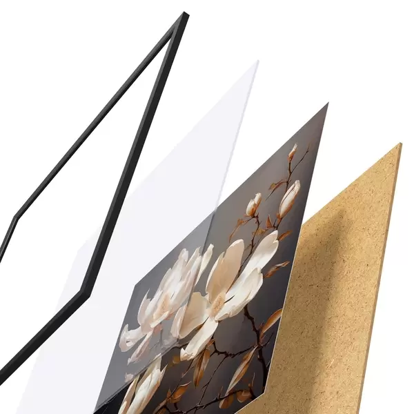 De poster bestaat uit een frame, plexiglas, geprinte afbeelding en spaanplaat achterkant. De poster kan meteen aan de muur worden gehangen dankzij de bevestigingen op de achterkant.