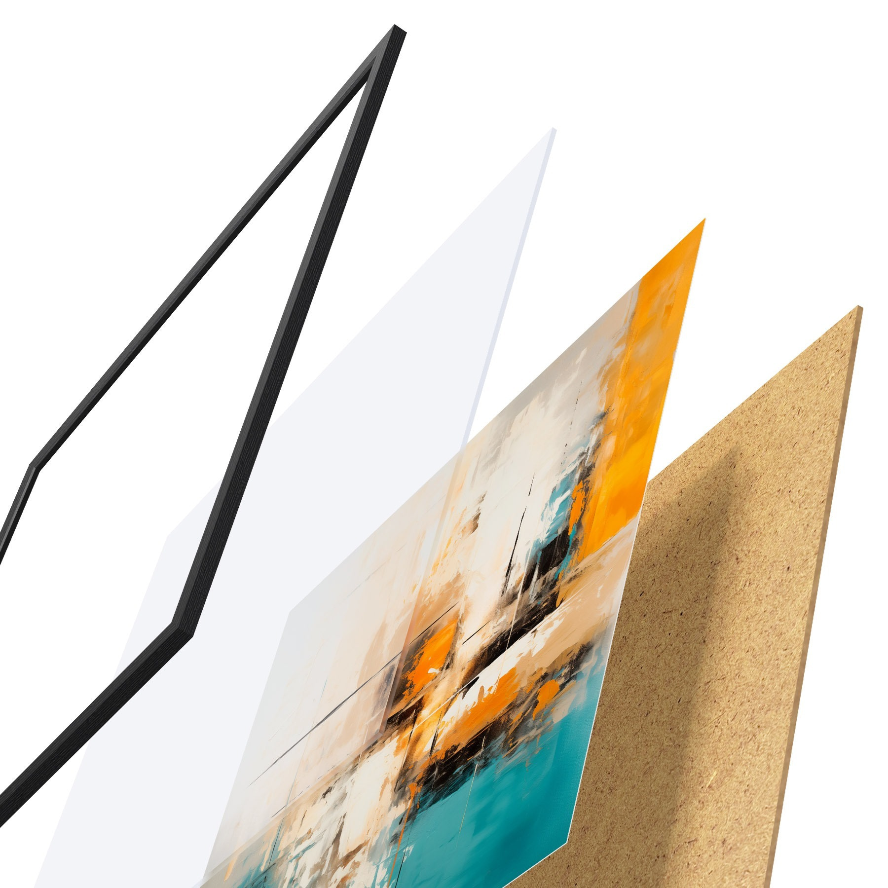 De poster bestaat uit een frame, plexiglas, geprinte afbeelding en spaanplaat achterkant. De poster kan meteen aan de muur worden gehangen dankzij de bevestigingen op de achterkant.