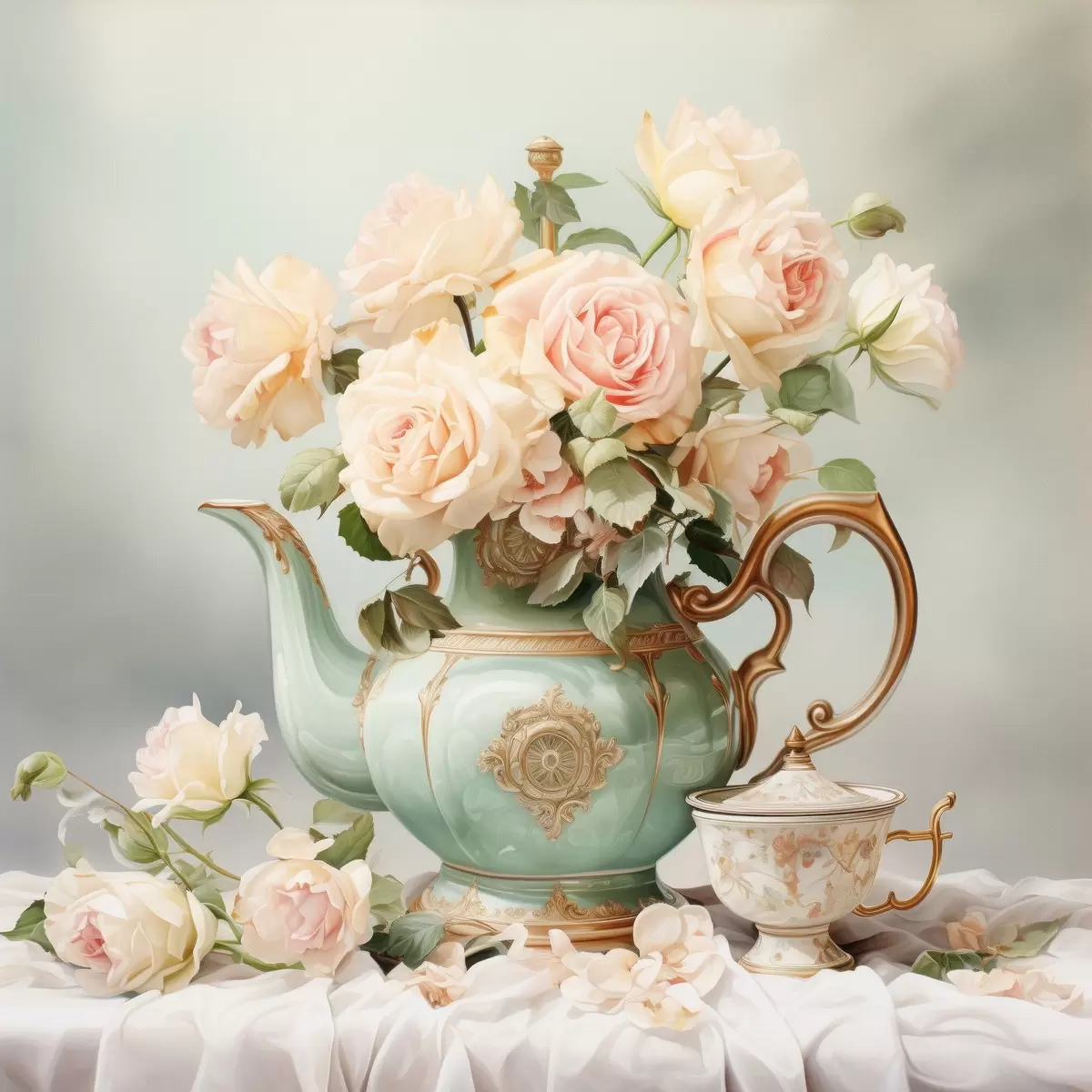 Poster Stilleven met delicate rozen in een theeserviesje f45045