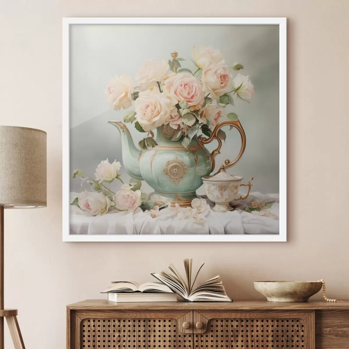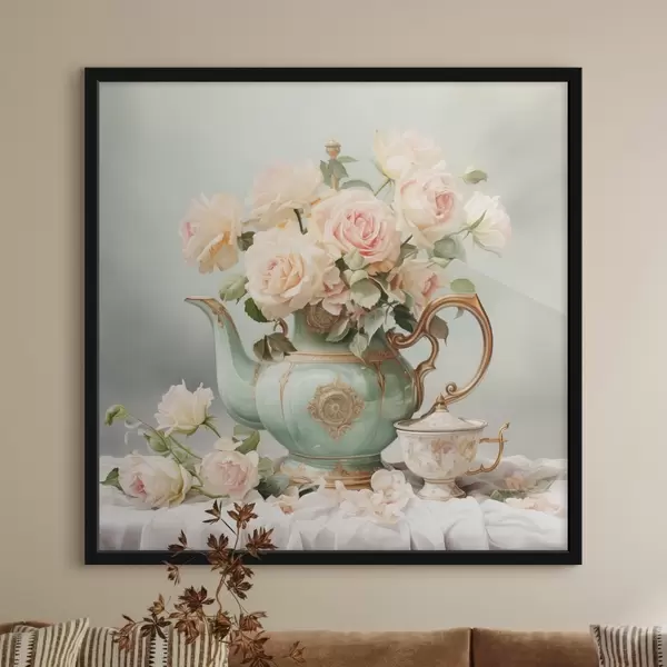 Poster Stilleven met delicate rozen in een theeserviesje Nr f45045