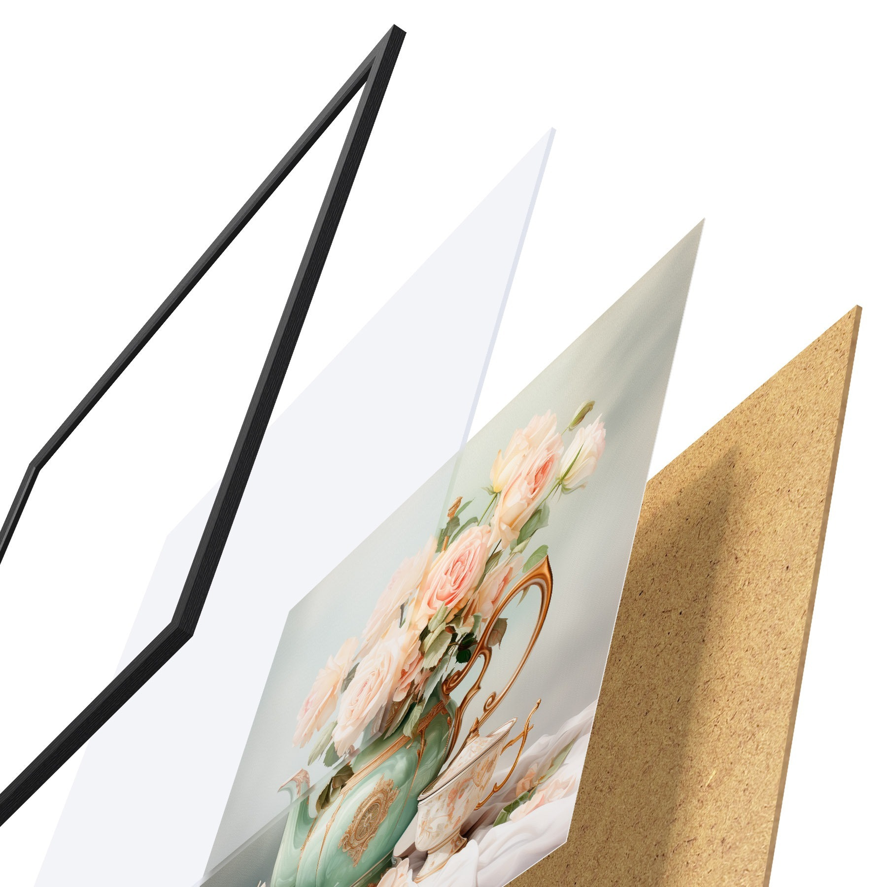 De poster bestaat uit een frame, plexiglas, geprinte afbeelding en spaanplaat achterkant. De poster kan meteen aan de muur worden gehangen dankzij de bevestigingen op de achterkant.