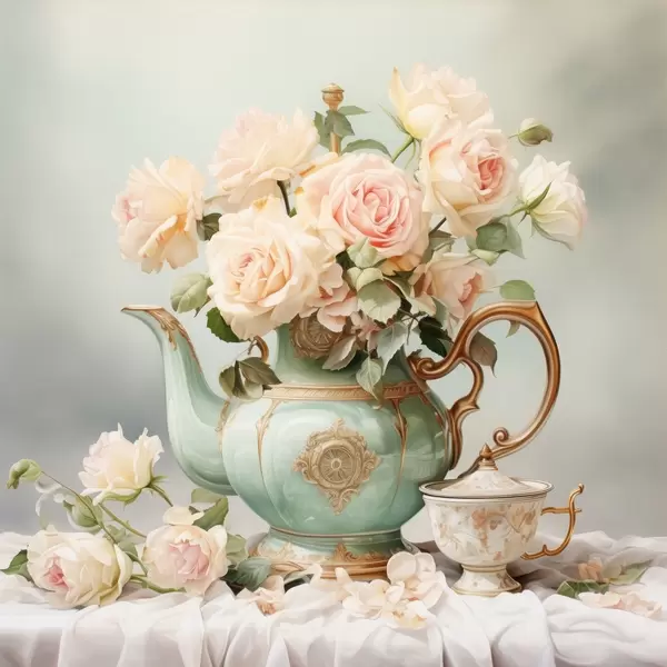 Poster Stilleven met delicate rozen in een theeserviesje Nr f45045
