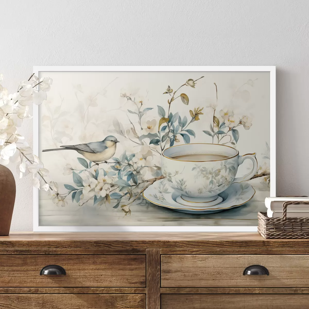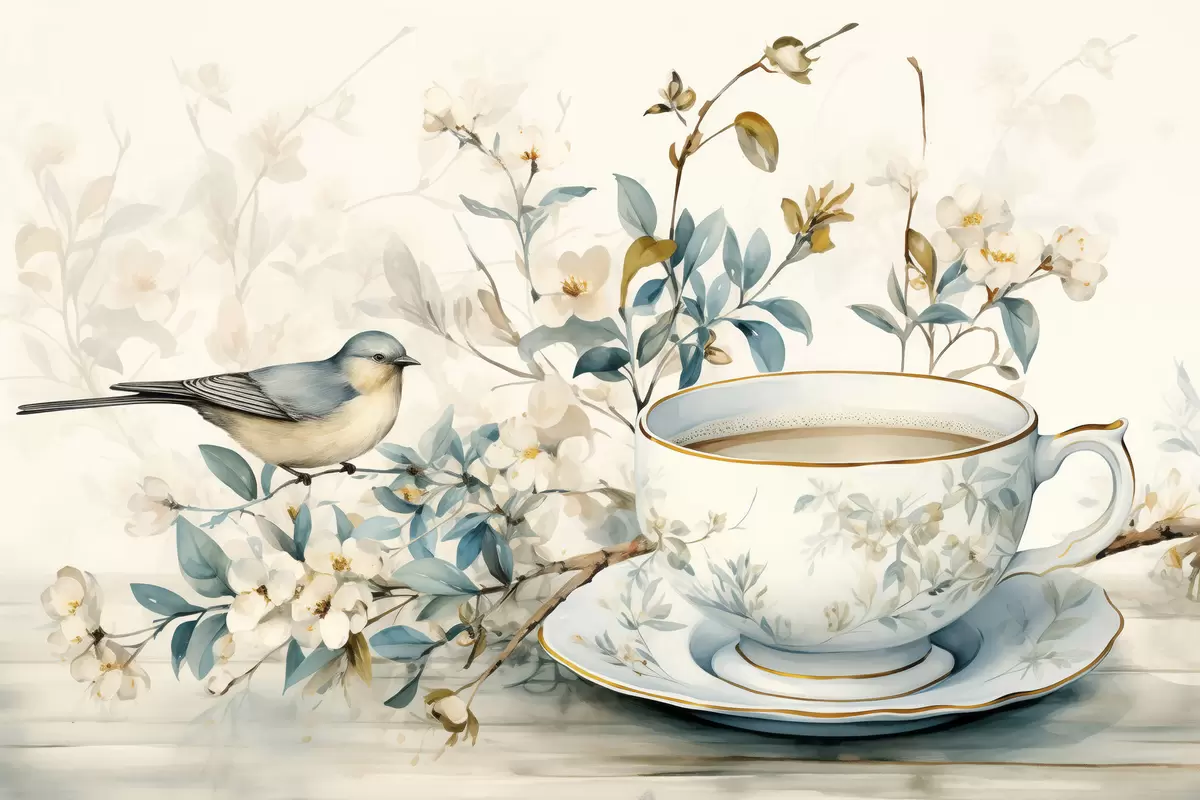 Poster Vogel op een tak met bloemen bij een kopje in pasteltinten Nr f45047