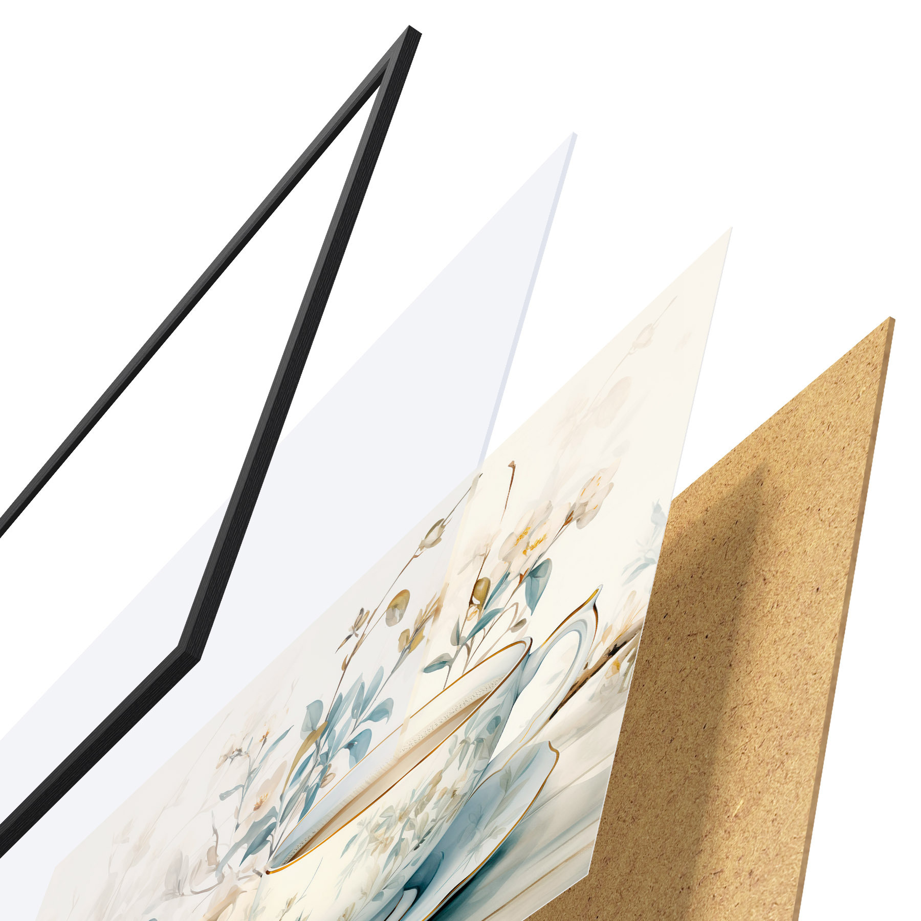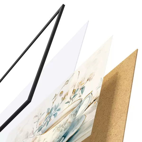 De poster bestaat uit een frame, plexiglas, geprinte afbeelding en spaanplaat achterkant. De poster kan meteen aan de muur worden gehangen dankzij de bevestigingen op de achterkant.