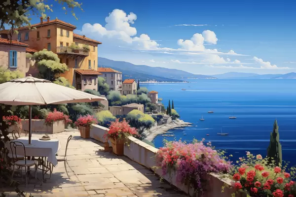 Poster Mediterraan landschap met bloeiend terras in artistieke stijl Nr f45053