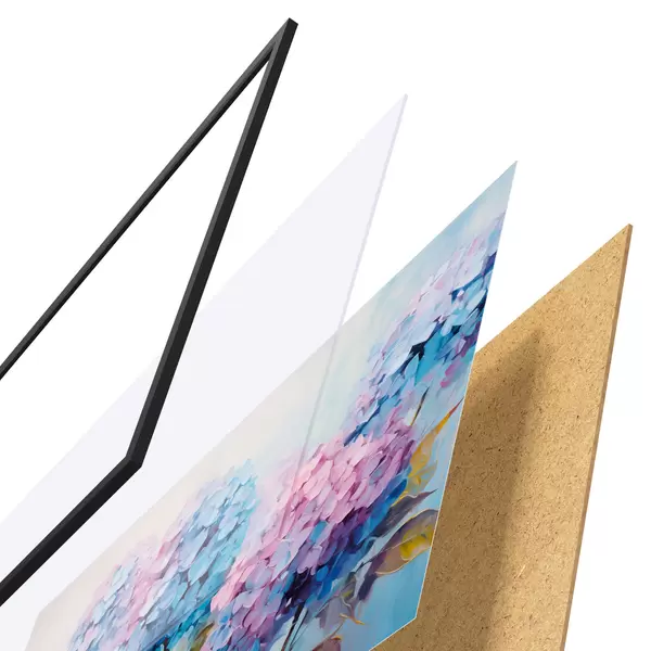 De poster bestaat uit een frame, plexiglas, geprinte afbeelding en spaanplaat achterkant. De poster kan meteen aan de muur worden gehangen dankzij de bevestigingen op de achterkant.