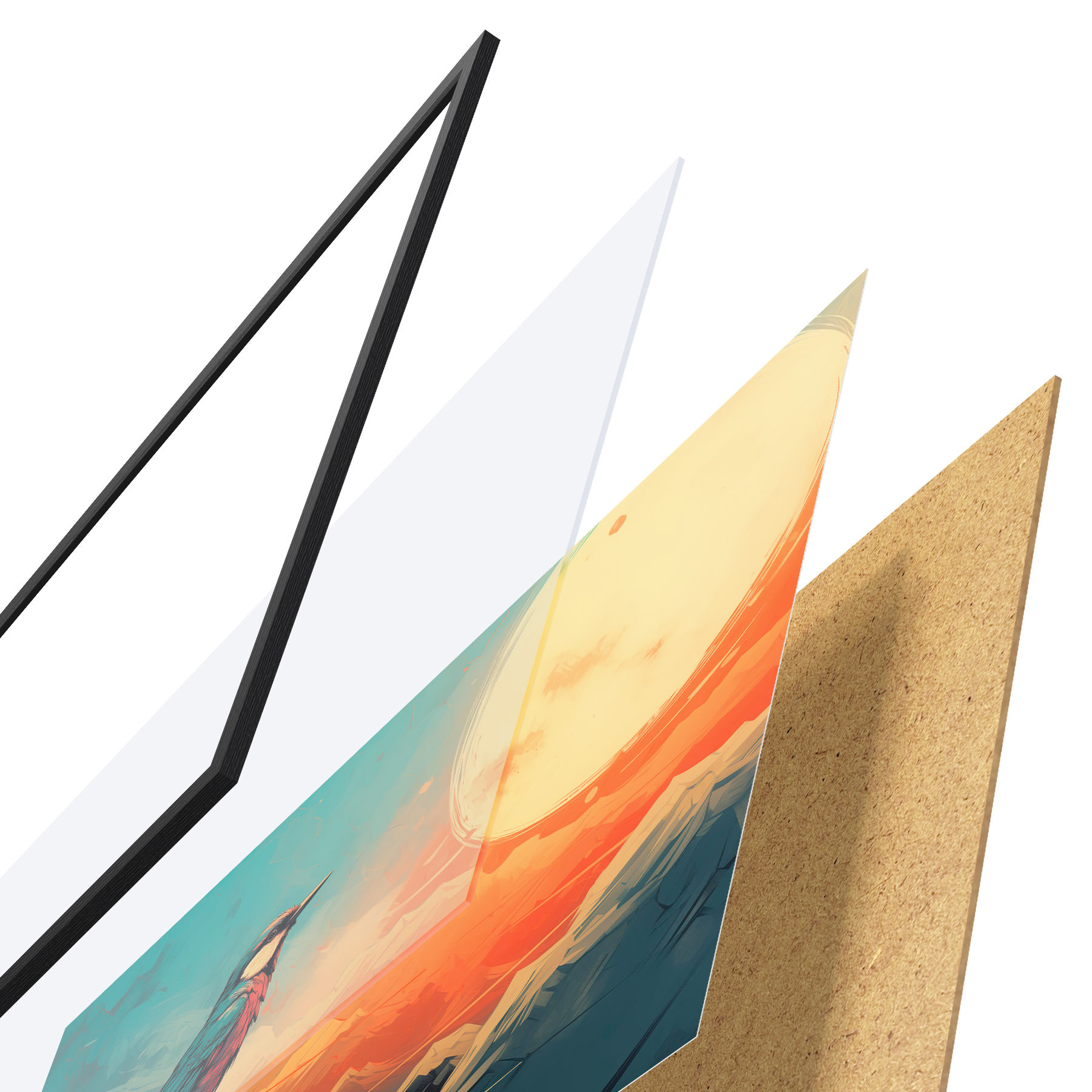 De poster bestaat uit een frame, plexiglas, geprinte afbeelding en spaanplaat achterkant. De poster kan meteen aan de muur worden gehangen dankzij de bevestigingen op de achterkant.