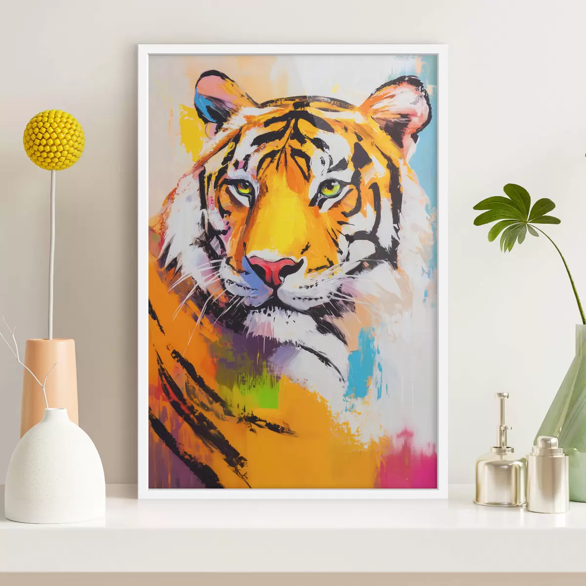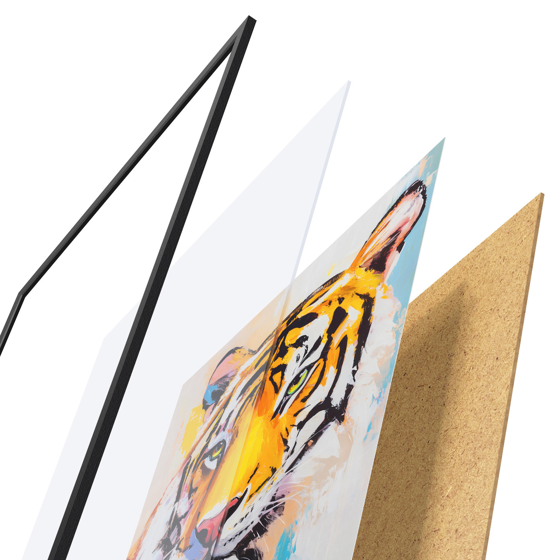 De poster bestaat uit een frame, plexiglas, geprinte afbeelding en spaanplaat achterkant. De poster kan meteen aan de muur worden gehangen dankzij de bevestigingen op de achterkant.