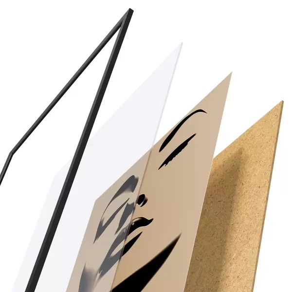 De poster bestaat uit een frame, plexiglas, geprinte afbeelding en spaanplaat achterkant. De poster kan meteen aan de muur worden gehangen dankzij de bevestigingen op de achterkant.