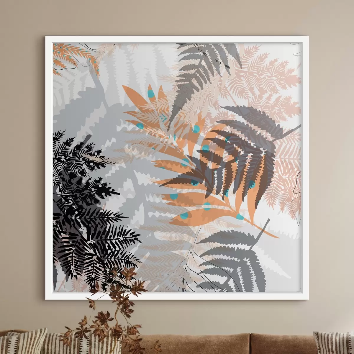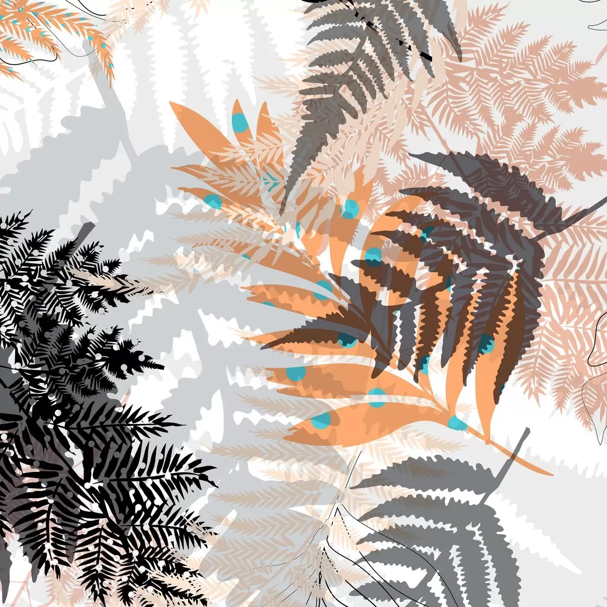 Poster jungle gebladerte, moderne stijl, lijntekeningen, gelaagde planten, gedempte kleuren, natuur Nr f45102