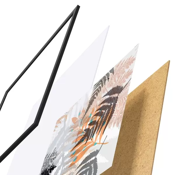De poster bestaat uit een frame, plexiglas, geprinte afbeelding en spaanplaat achterkant. De poster kan meteen aan de muur worden gehangen dankzij de bevestigingen op de achterkant.