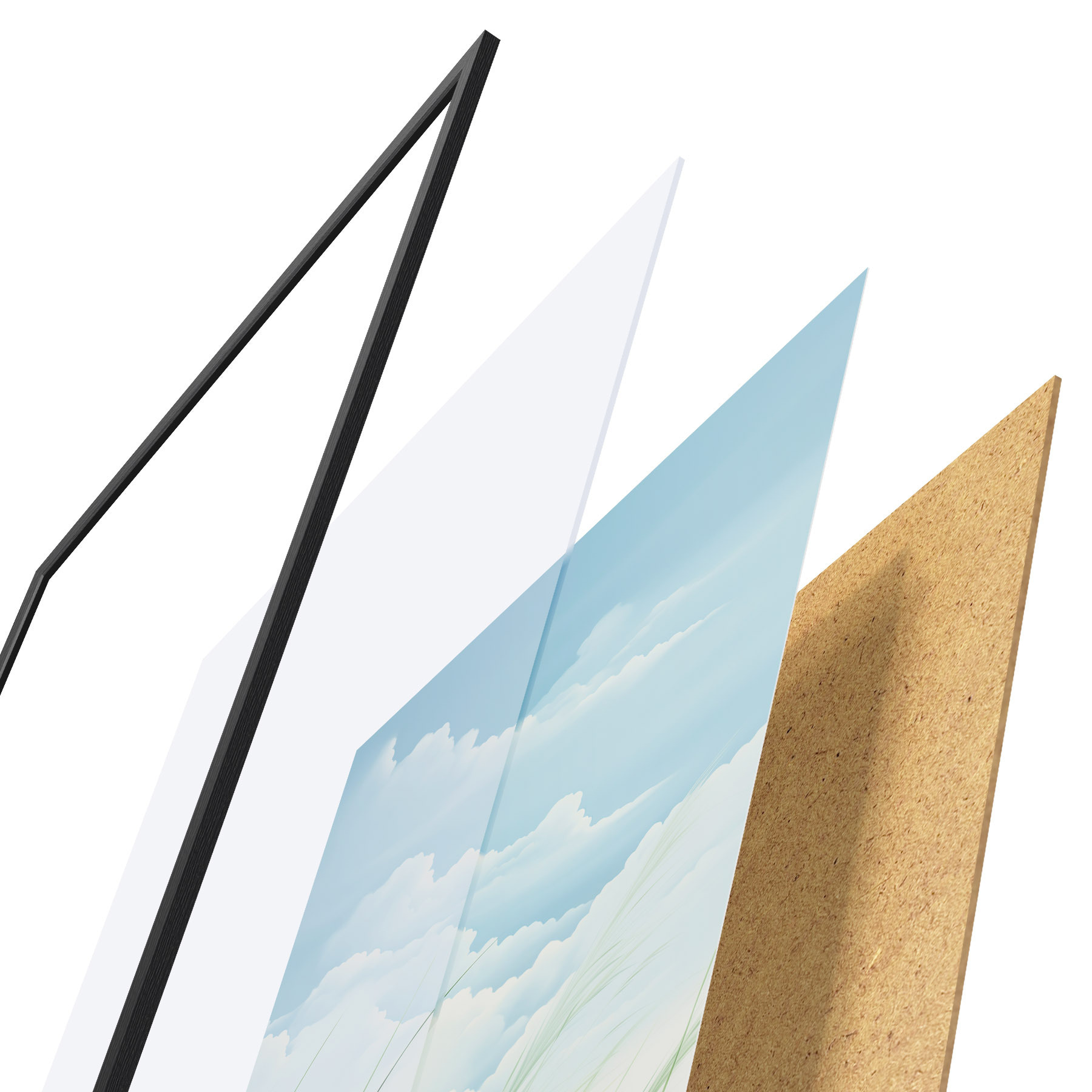 De poster bestaat uit een frame, plexiglas, geprinte afbeelding en spaanplaat achterkant. De poster kan meteen aan de muur worden gehangen dankzij de bevestigingen op de achterkant.