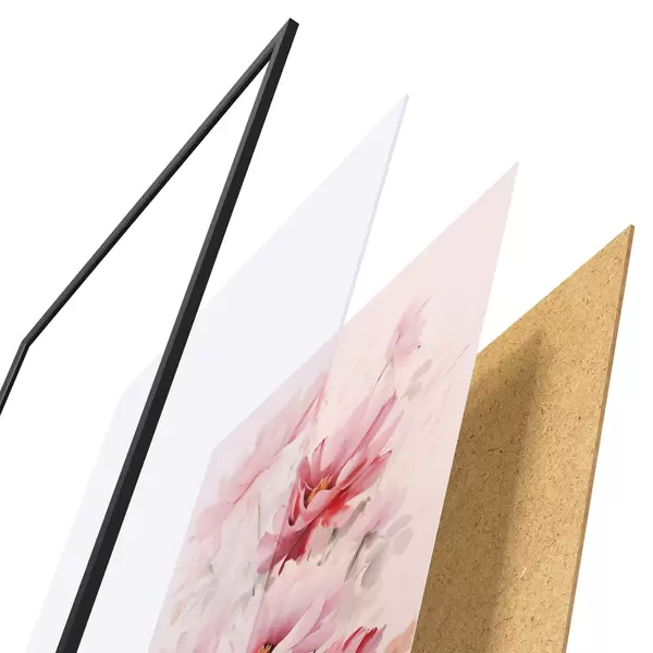 De poster bestaat uit een frame, plexiglas, geprinte afbeelding en spaanplaat achterkant. De poster kan meteen aan de muur worden gehangen dankzij de bevestigingen op de achterkant.