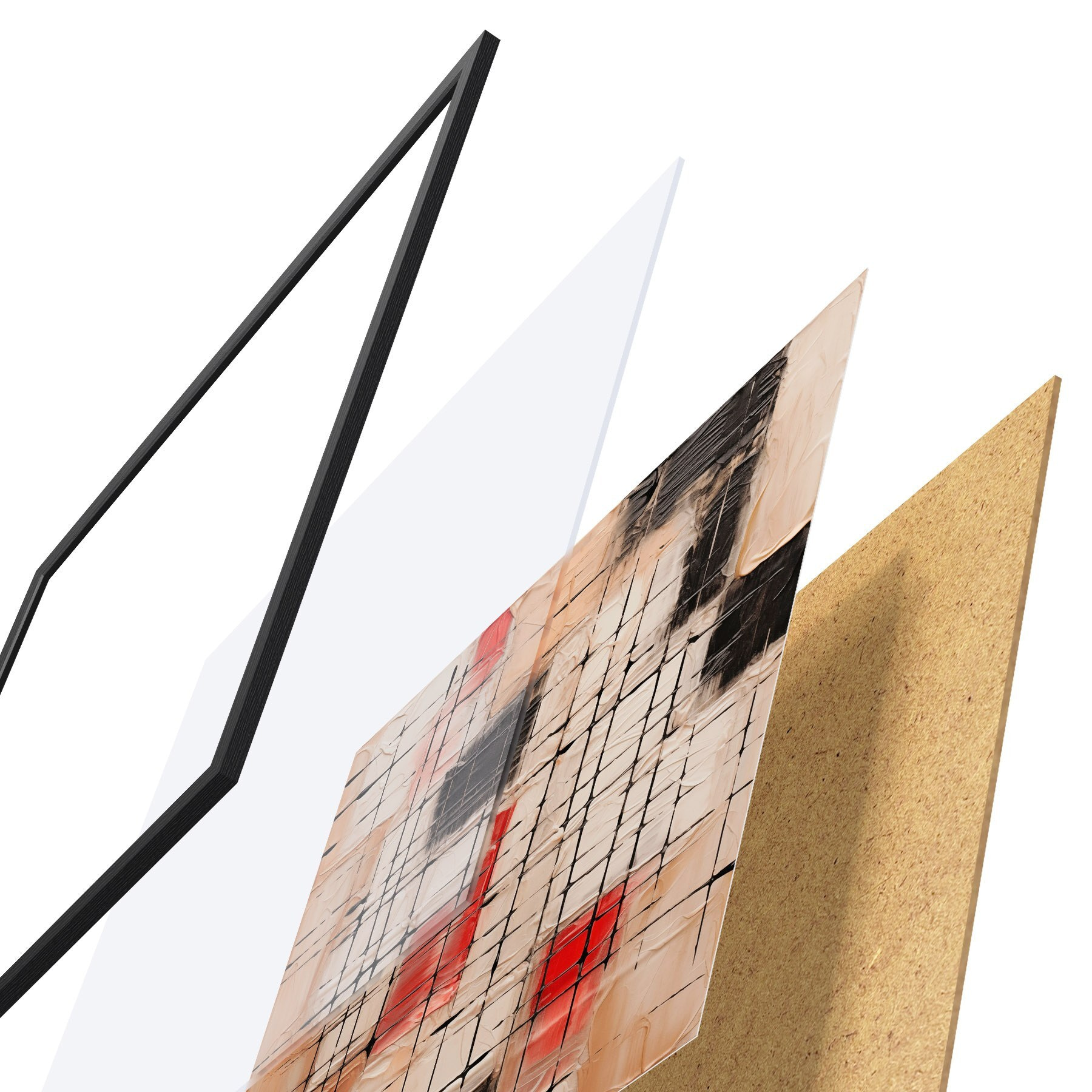 De poster bestaat uit een frame, plexiglas, geprinte afbeelding en spaanplaat achterkant. De poster kan meteen aan de muur worden gehangen dankzij de bevestigingen op de achterkant.
