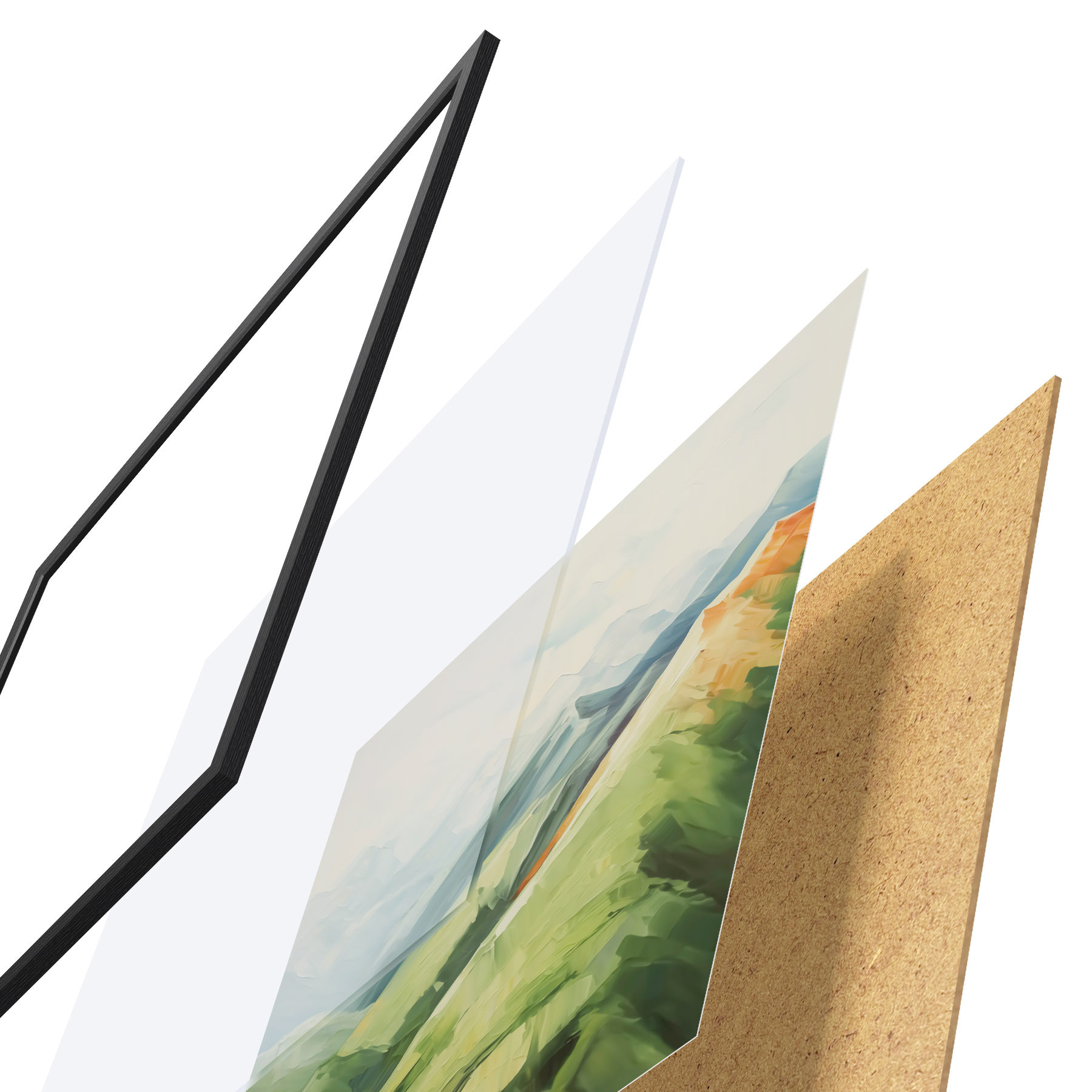 De poster bestaat uit een frame, plexiglas, geprinte afbeelding en spaanplaat achterkant. De poster kan meteen aan de muur worden gehangen dankzij de bevestigingen op de achterkant.