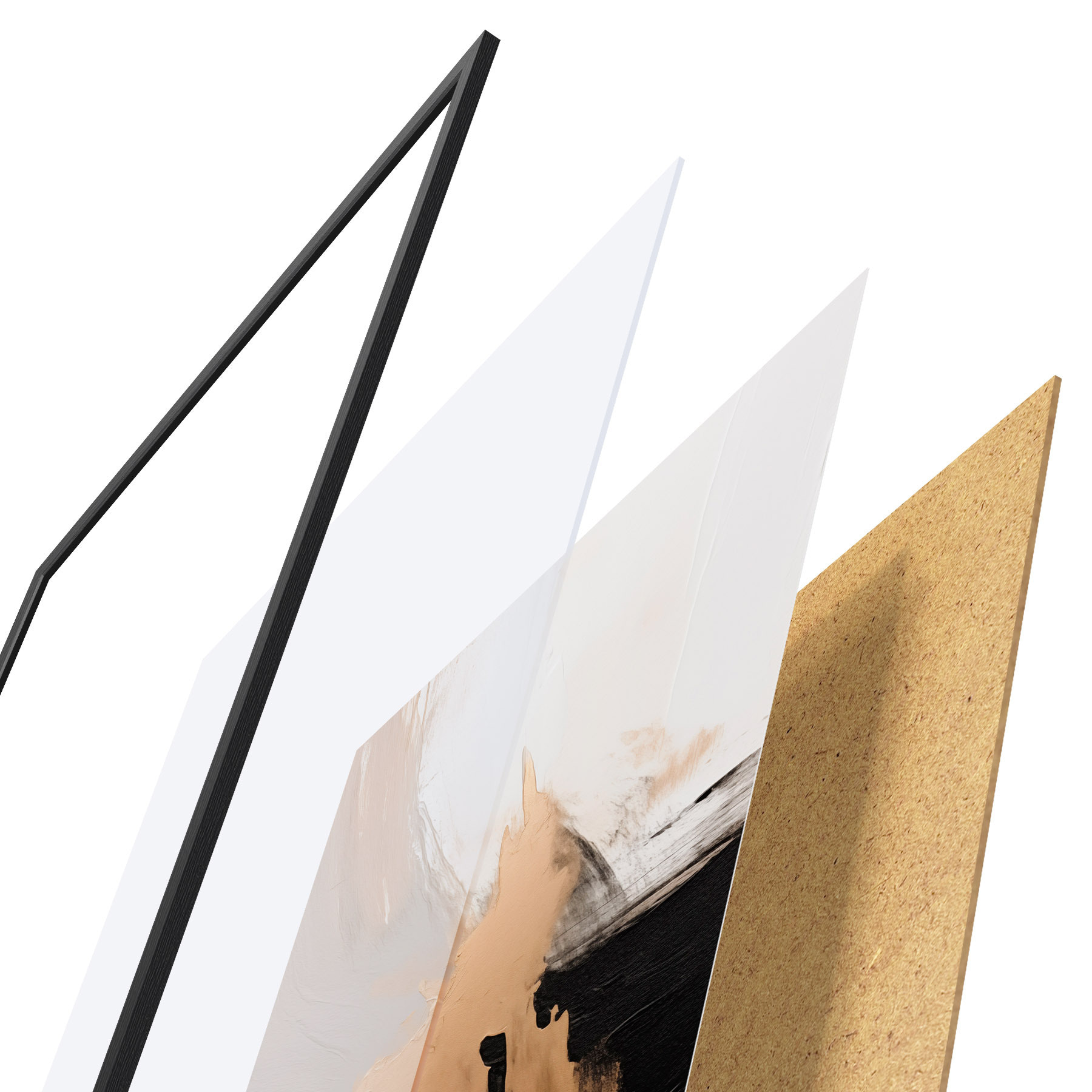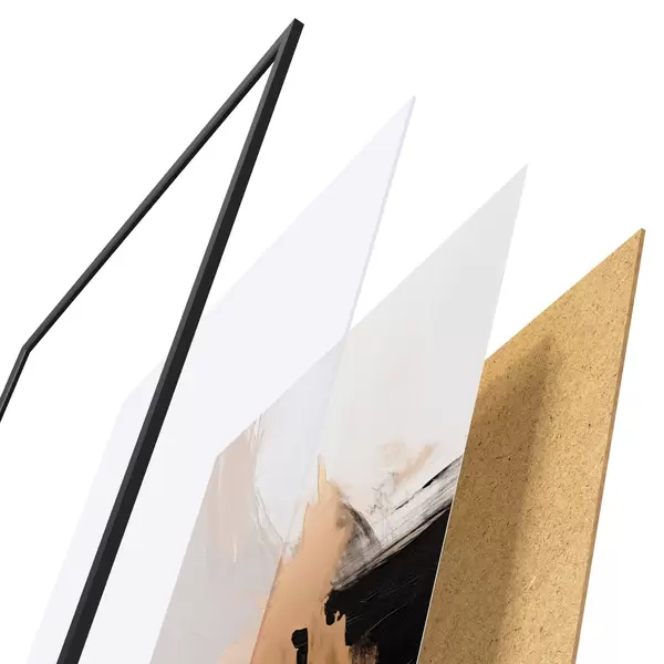 De poster bestaat uit een frame, plexiglas, geprinte afbeelding en spaanplaat achterkant. De poster kan meteen aan de muur worden gehangen dankzij de bevestigingen op de achterkant.