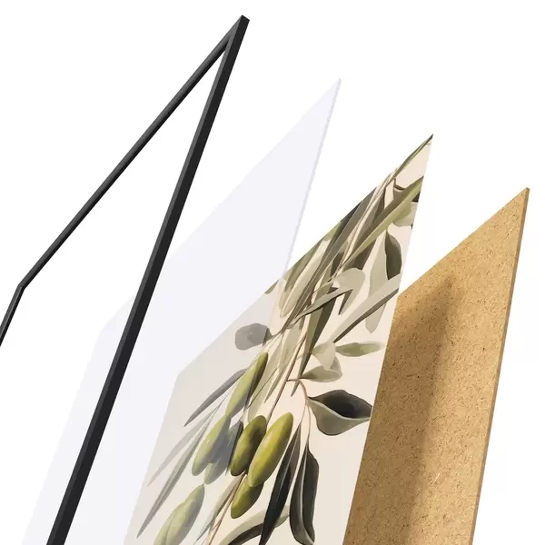 De poster bestaat uit een frame, plexiglas, geprinte afbeelding en spaanplaat achterkant. De poster kan meteen aan de muur worden gehangen dankzij de bevestigingen op de achterkant.