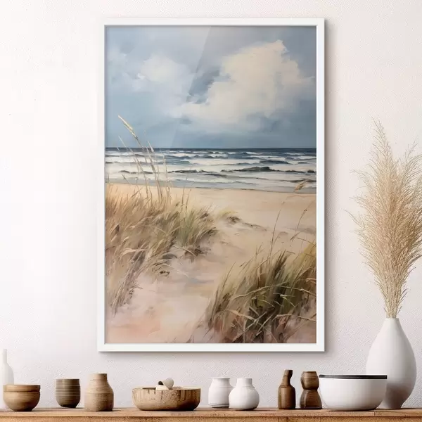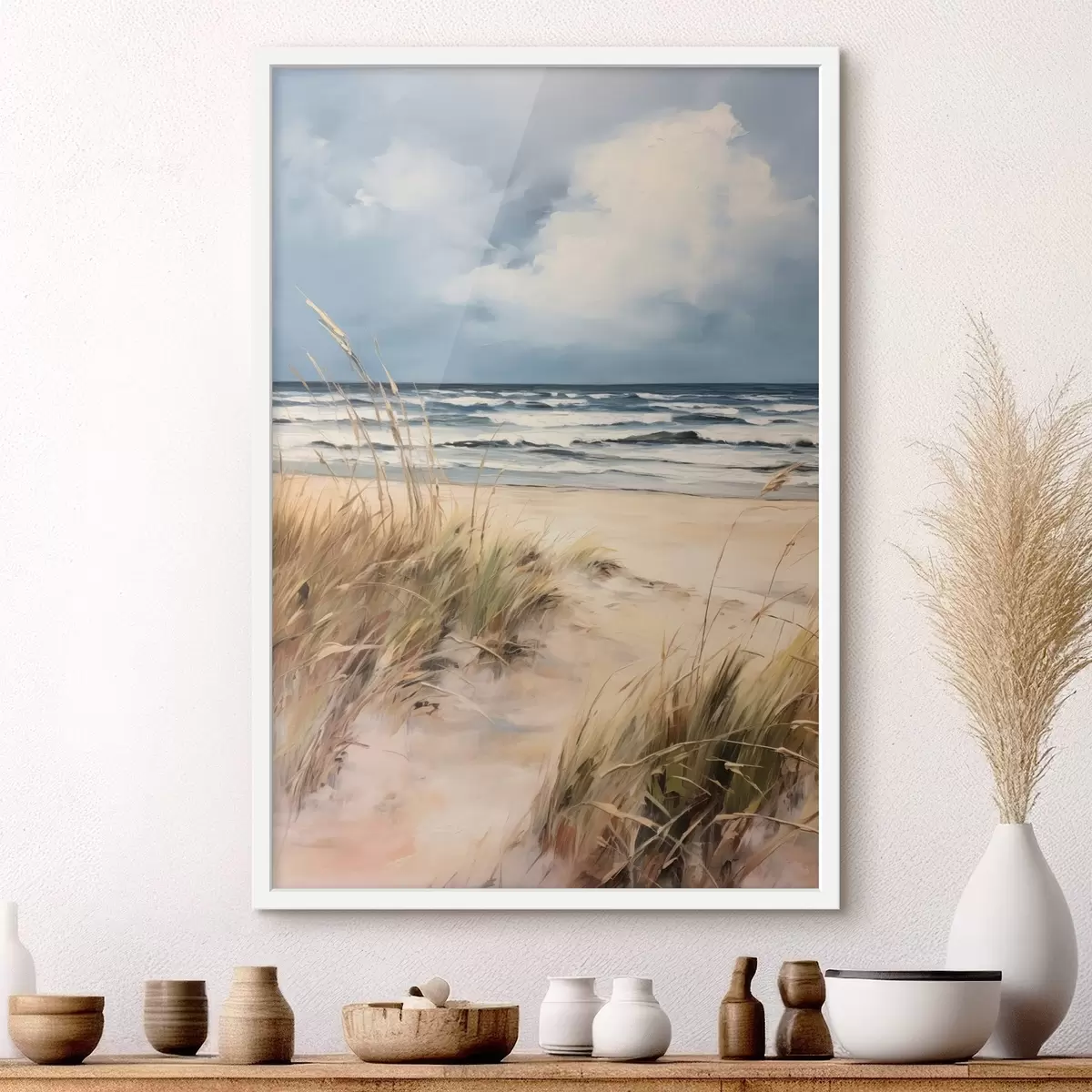Poster Een zandstrand met hoog gras op de voorgrond, de oceaan met golven en een bewolkte lucht op de achtergrond Nr f45173