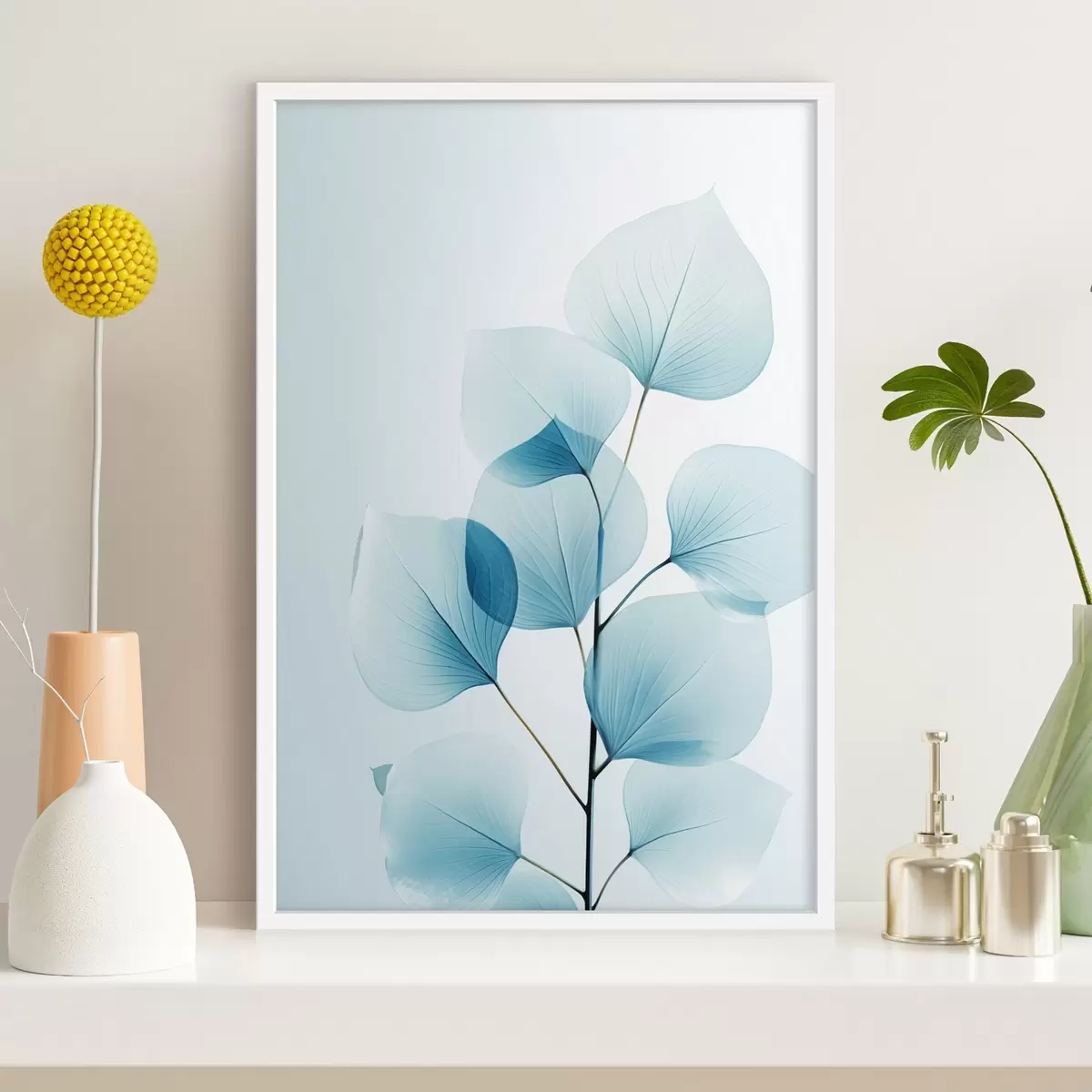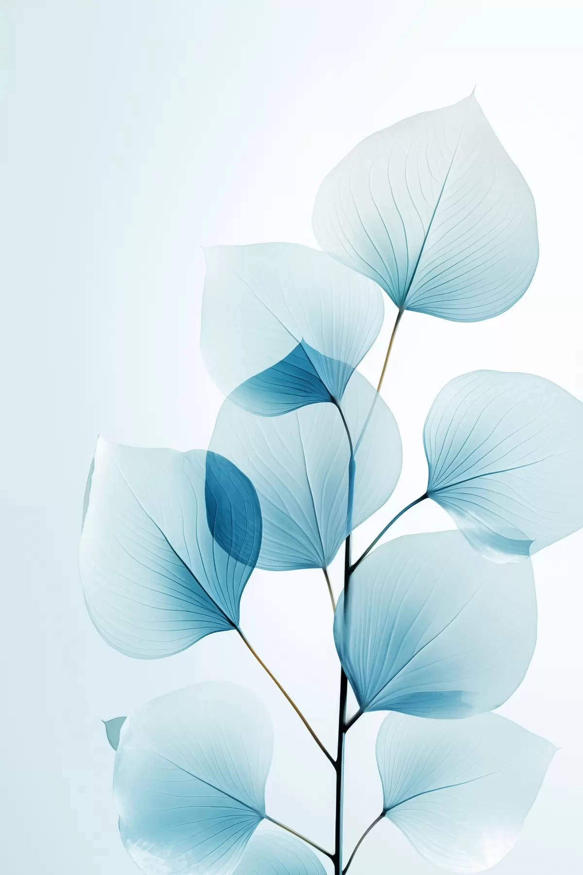 Poster Tak met doorschijnende blauwe bladeren, fijne nerven zichtbaar, lichte en rustige compositie, minimalistische esthetiek Nr f45175