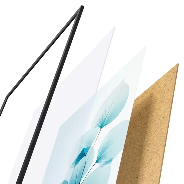 De poster bestaat uit een frame, plexiglas, geprinte afbeelding en spaanplaat achterkant. De poster kan meteen aan de muur worden gehangen dankzij de bevestigingen op de achterkant.