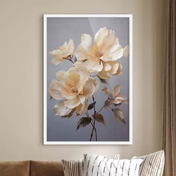 Poster Gestructureerde bloemen met oranje stampers en oranje bladeren op grijze achtergrond, zacht licht, elegant, gedetailleerd, realistisch Nr f45182