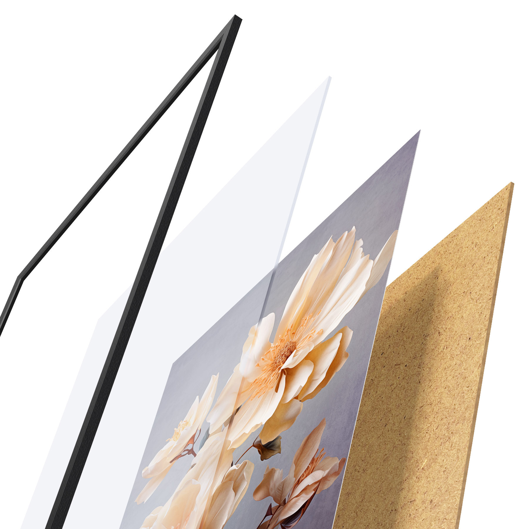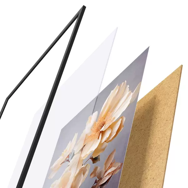 De poster bestaat uit een frame, plexiglas, geprinte afbeelding en spaanplaat achterkant. De poster kan meteen aan de muur worden gehangen dankzij de bevestigingen op de achterkant.