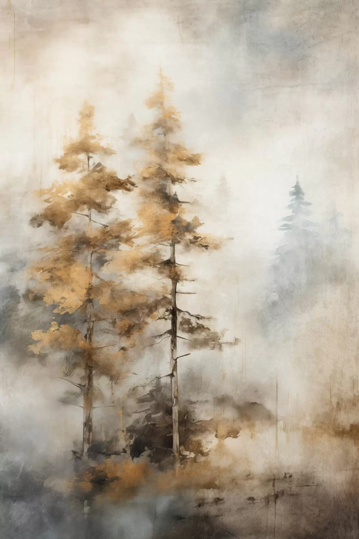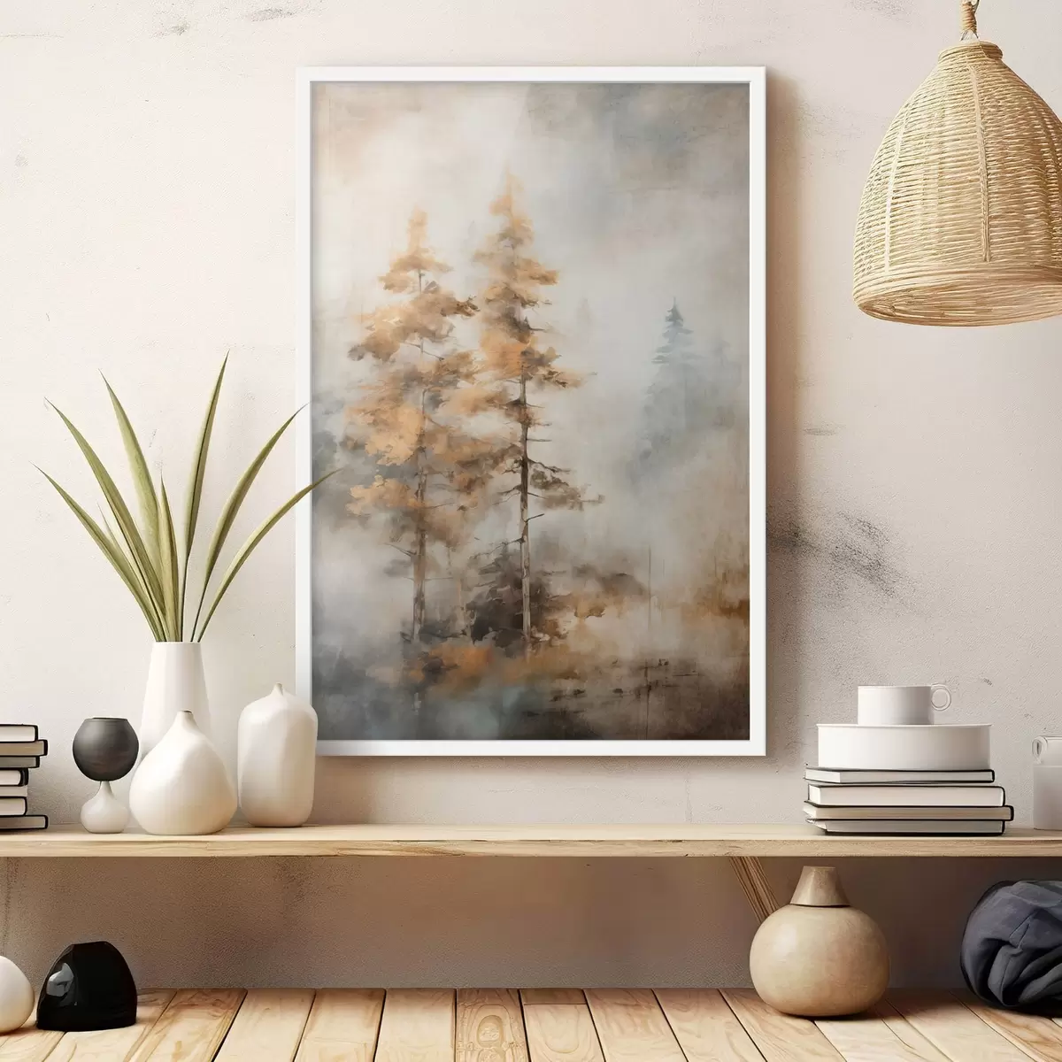 Poster Hoge bomen met gele bladeren in een bos, de achtergrond is een mix van zachte blauwe en bruine tinten Nr f45188