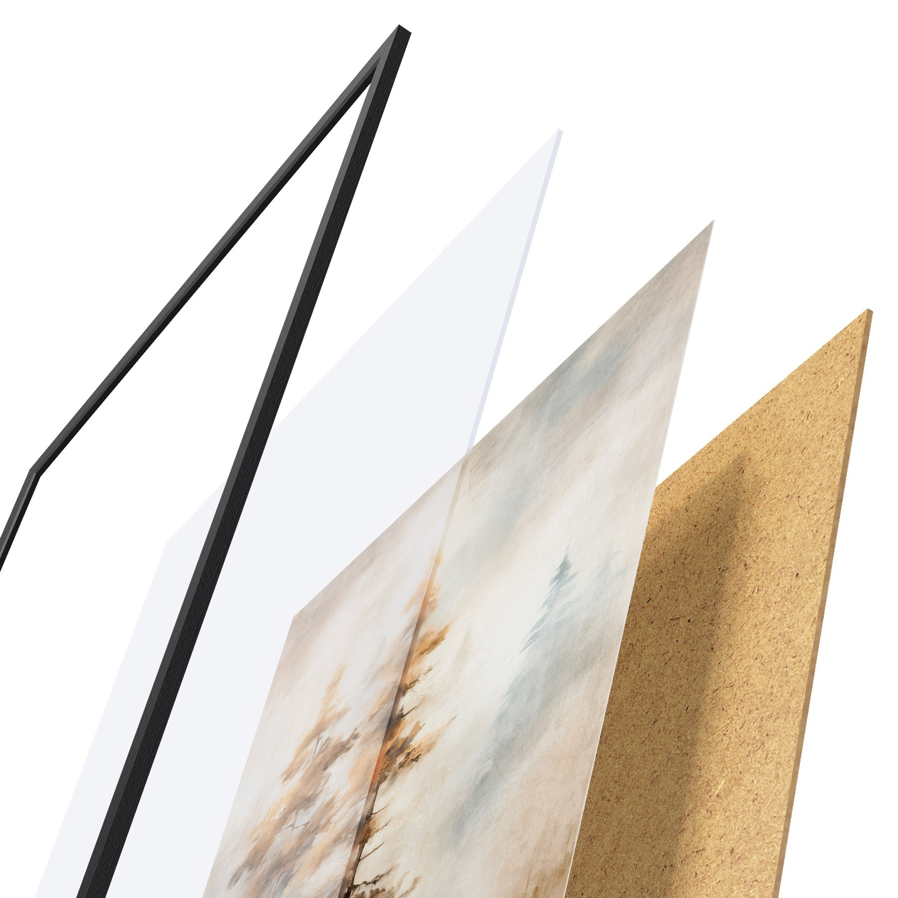 De poster bestaat uit een frame, plexiglas, geprinte afbeelding en spaanplaat achterkant. De poster kan meteen aan de muur worden gehangen dankzij de bevestigingen op de achterkant.