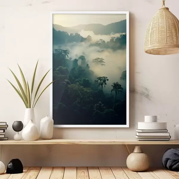 Poster Tropisch regenwoud met weelderige groene bomen en een dikke laag mist, waardoor een sfeervolle omgeving ontstaat Nr f45190