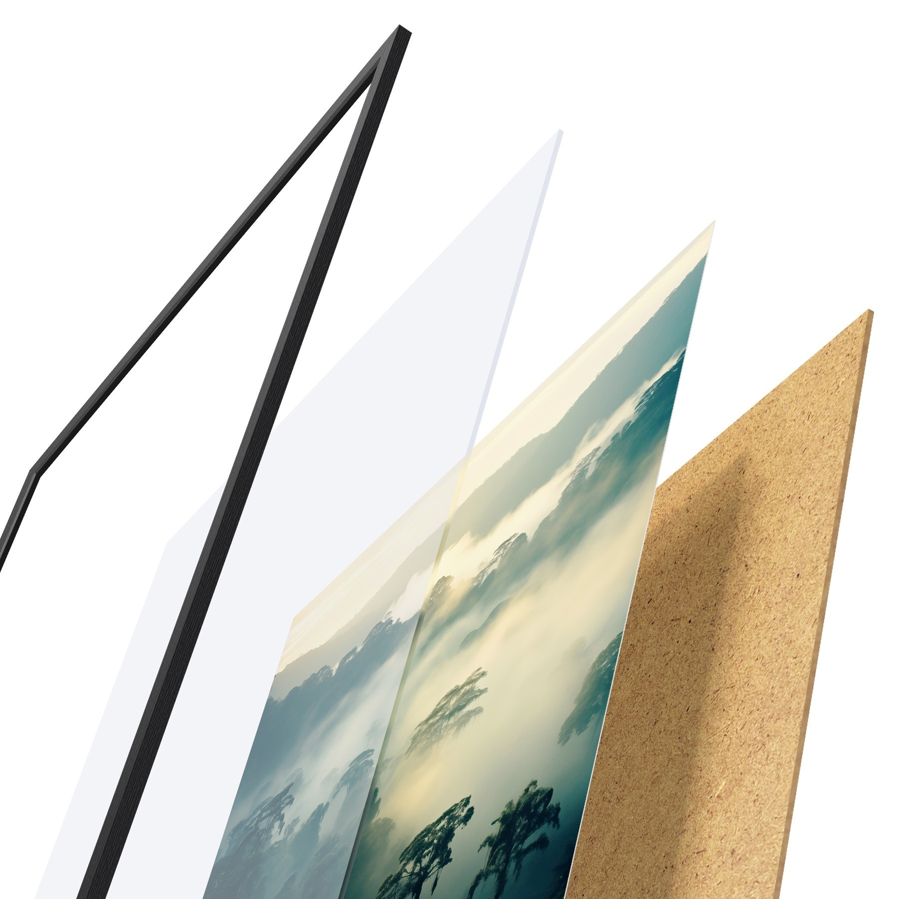 De poster bestaat uit een frame, plexiglas, geprinte afbeelding en spaanplaat achterkant. De poster kan meteen aan de muur worden gehangen dankzij de bevestigingen op de achterkant.