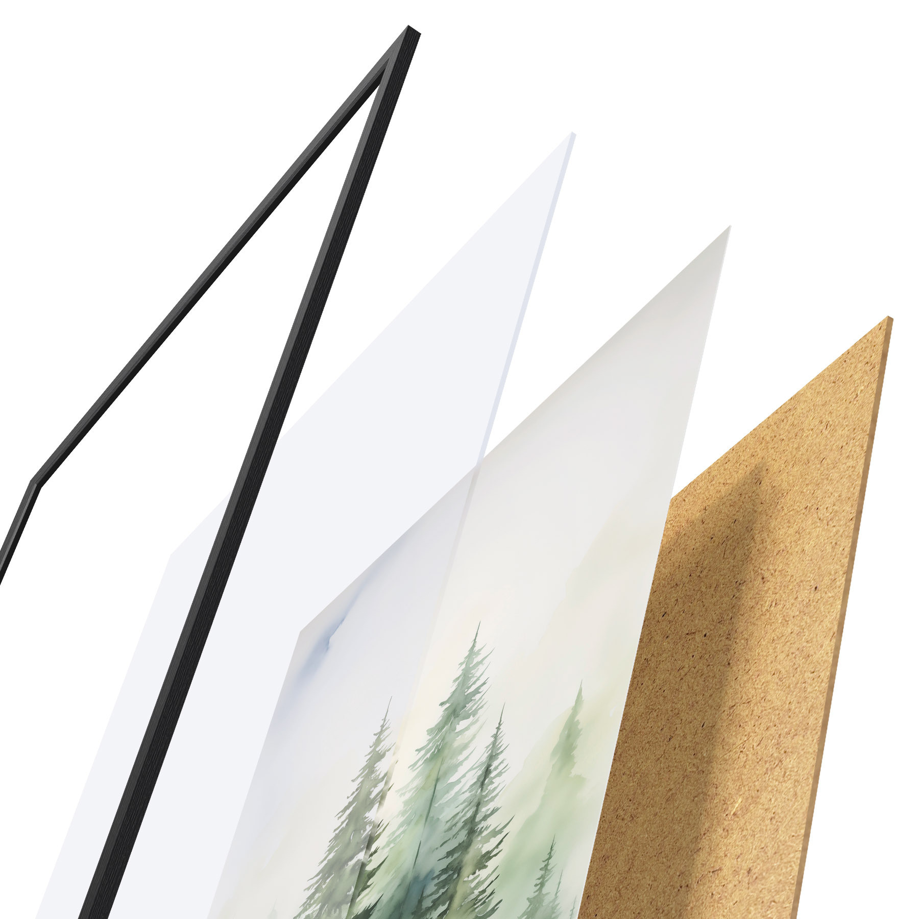 De poster bestaat uit een frame, plexiglas, geprinte afbeelding en spaanplaat achterkant. De poster kan meteen aan de muur worden gehangen dankzij de bevestigingen op de achterkant.