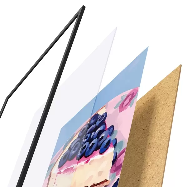 De poster bestaat uit een frame, plexiglas, geprinte afbeelding en spaanplaat achterkant. De poster kan meteen aan de muur worden gehangen dankzij de bevestigingen op de achterkant.