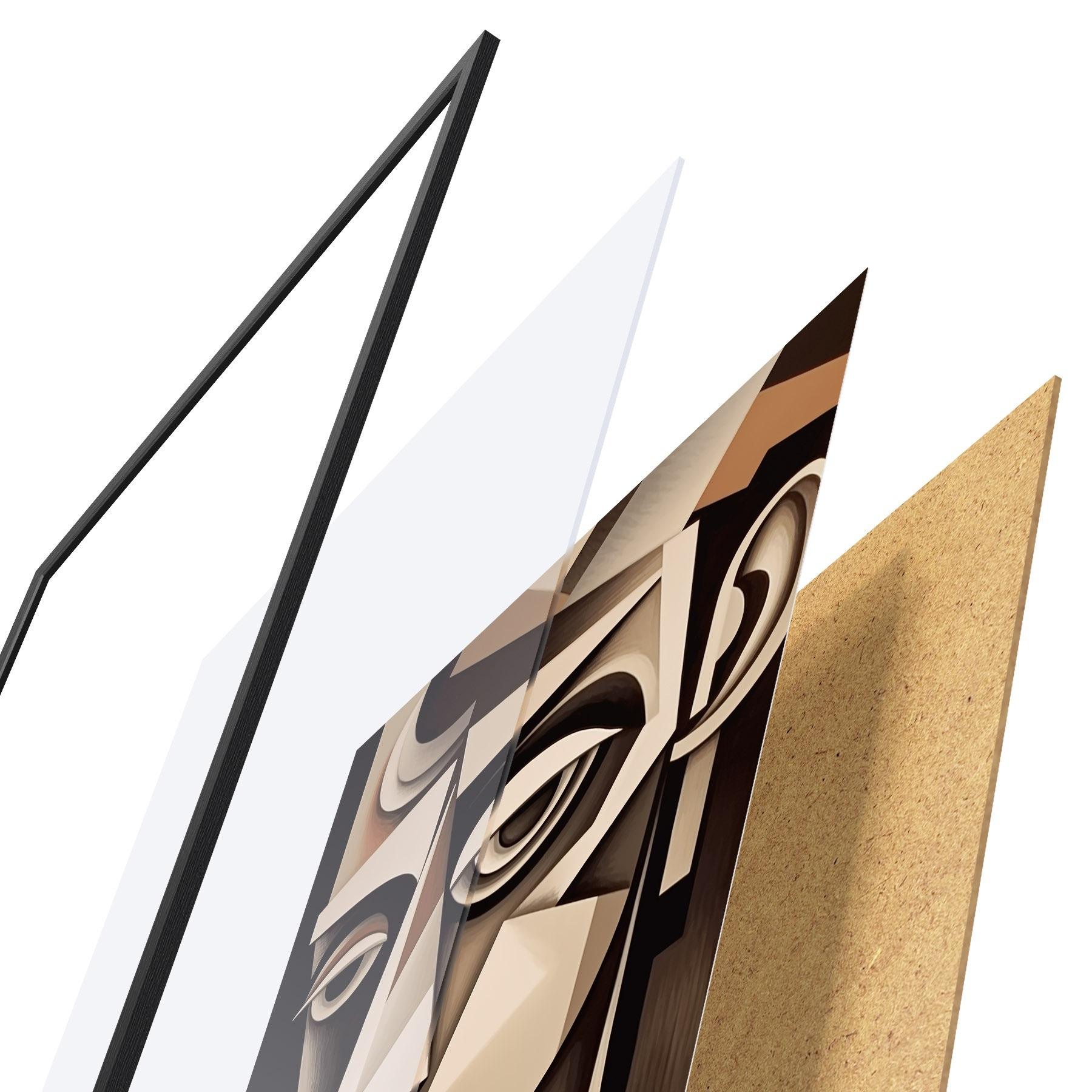 De poster bestaat uit een frame, plexiglas, geprinte afbeelding en spaanplaat achterkant. De poster kan meteen aan de muur worden gehangen dankzij de bevestigingen op de achterkant.