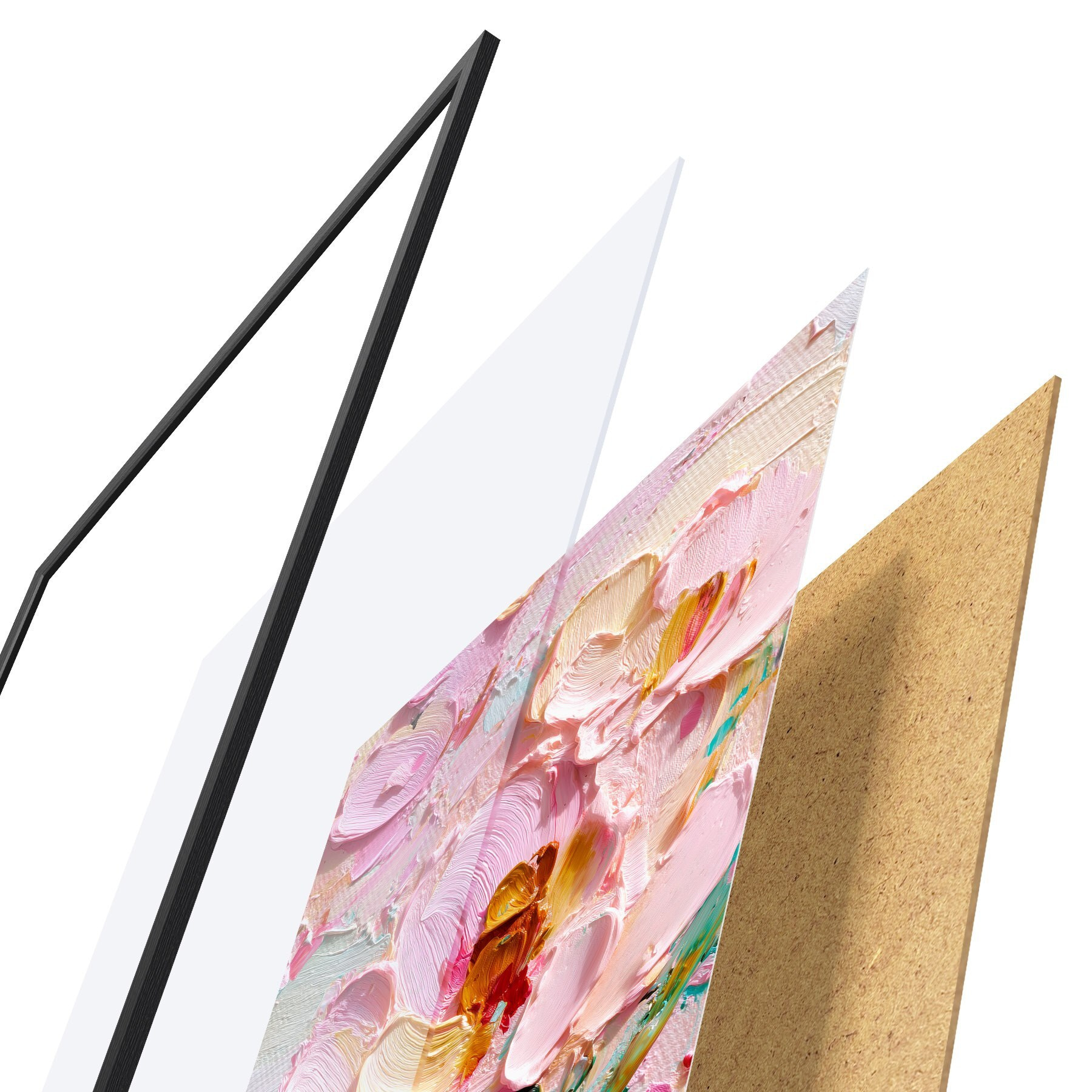 De poster bestaat uit een frame, plexiglas, geprinte afbeelding en spaanplaat achterkant. De poster kan meteen aan de muur worden gehangen dankzij de bevestigingen op de achterkant.