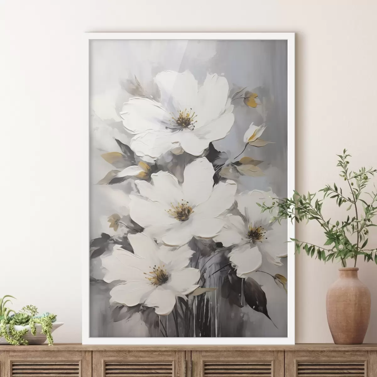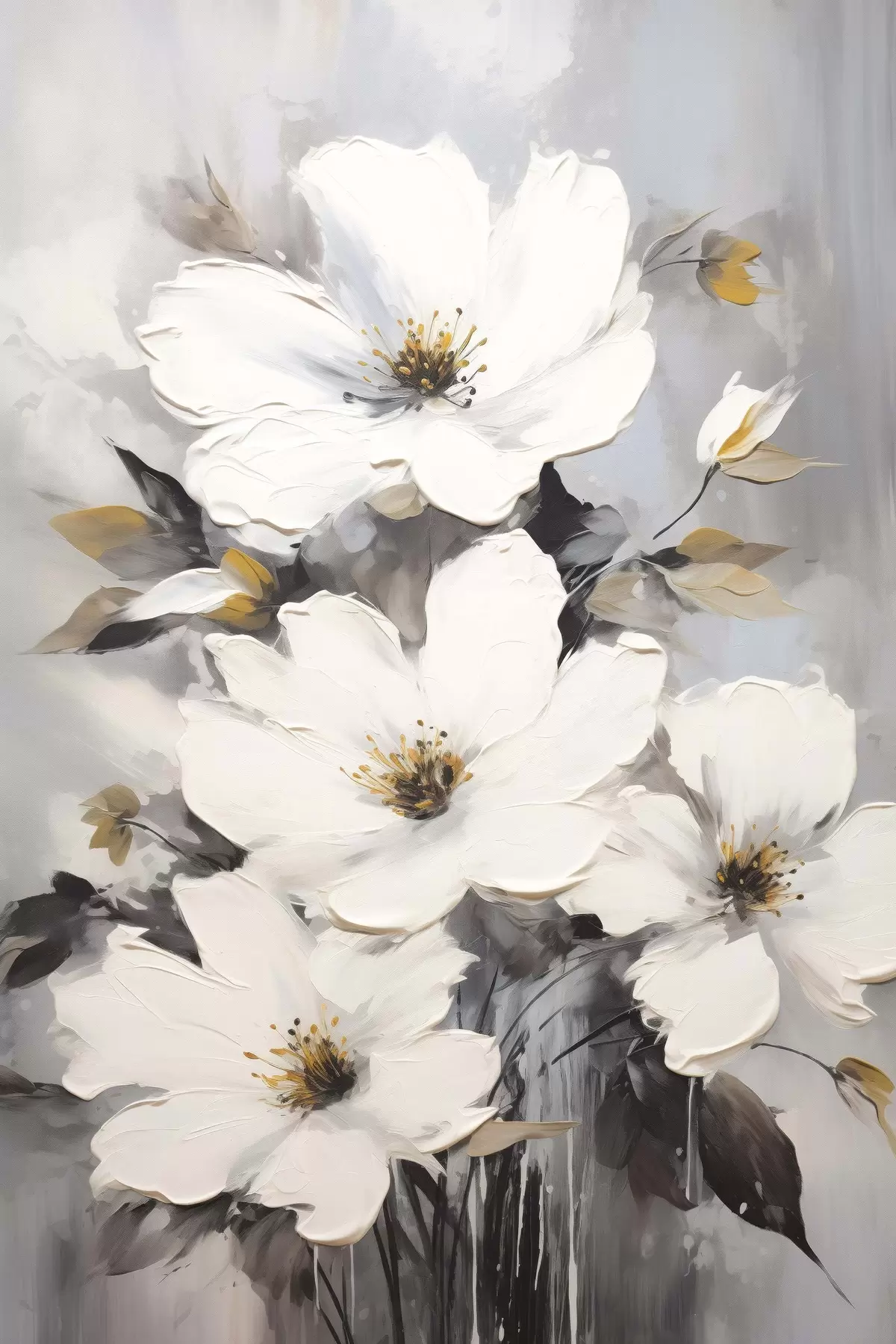 Poster Witte bloemen: volumetrisch schilderij op grijze achtergrond Nr f45252