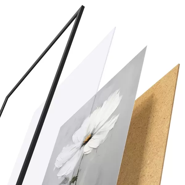 De poster bestaat uit een frame, plexiglas, geprinte afbeelding en spaanplaat achterkant. De poster kan meteen aan de muur worden gehangen dankzij de bevestigingen op de achterkant.