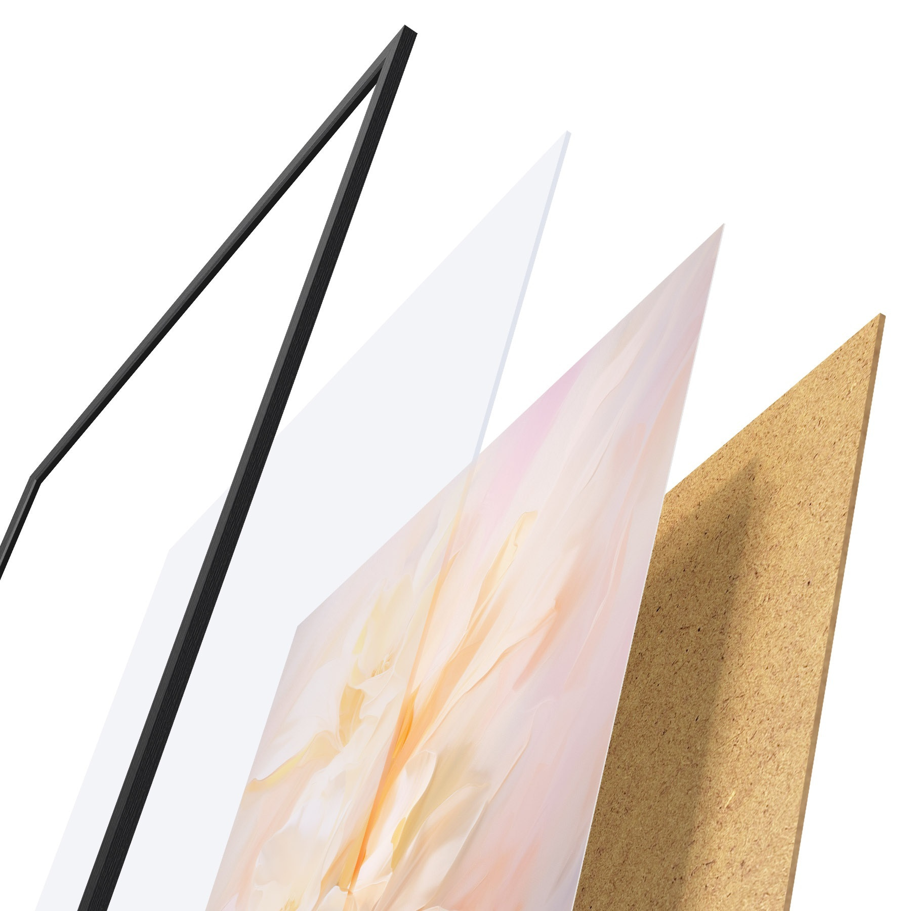 De poster bestaat uit een frame, plexiglas, geprinte afbeelding en spaanplaat achterkant. De poster kan meteen aan de muur worden gehangen dankzij de bevestigingen op de achterkant.
