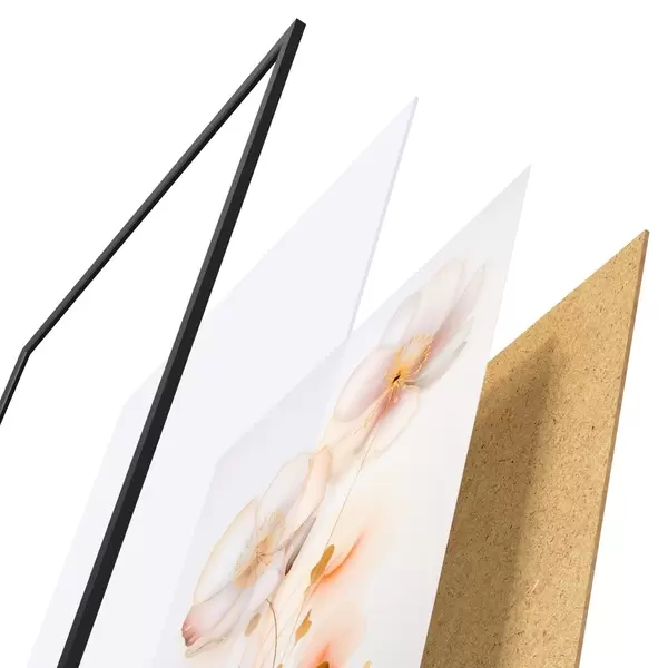 De poster bestaat uit een frame, plexiglas, geprinte afbeelding en spaanplaat achterkant. De poster kan meteen aan de muur worden gehangen dankzij de bevestigingen op de achterkant.