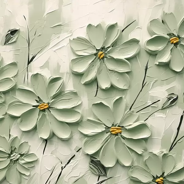 Poster Groene bloemen met gele harten geschilderd in dikke penseelstreken op een lichte achtergrond f45265