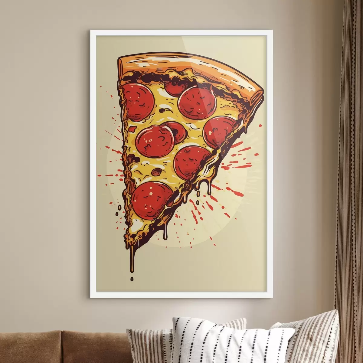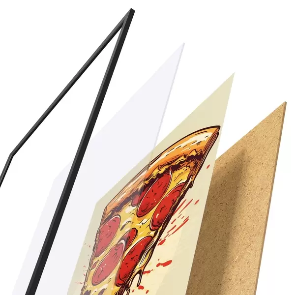 De poster bestaat uit een frame, plexiglas, geprinte afbeelding en spaanplaat achterkant. De poster kan meteen aan de muur worden gehangen dankzij de bevestigingen op de achterkant.