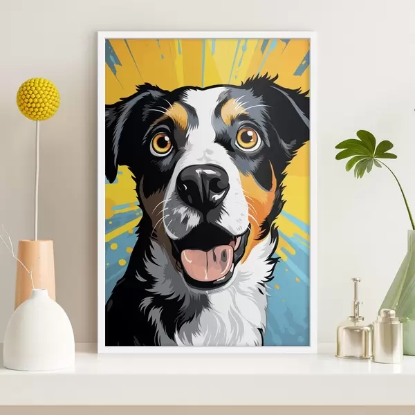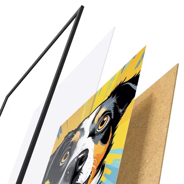 De poster bestaat uit een frame, plexiglas, geprinte afbeelding en spaanplaat achterkant. De poster kan meteen aan de muur worden gehangen dankzij de bevestigingen op de achterkant.
