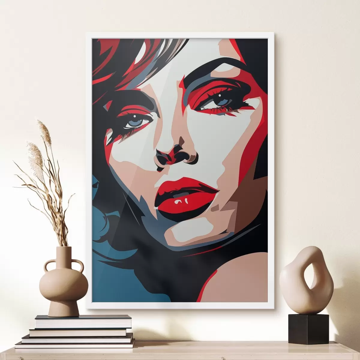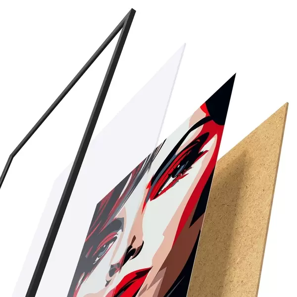 De poster bestaat uit een frame, plexiglas, geprinte afbeelding en spaanplaat achterkant. De poster kan meteen aan de muur worden gehangen dankzij de bevestigingen op de achterkant.