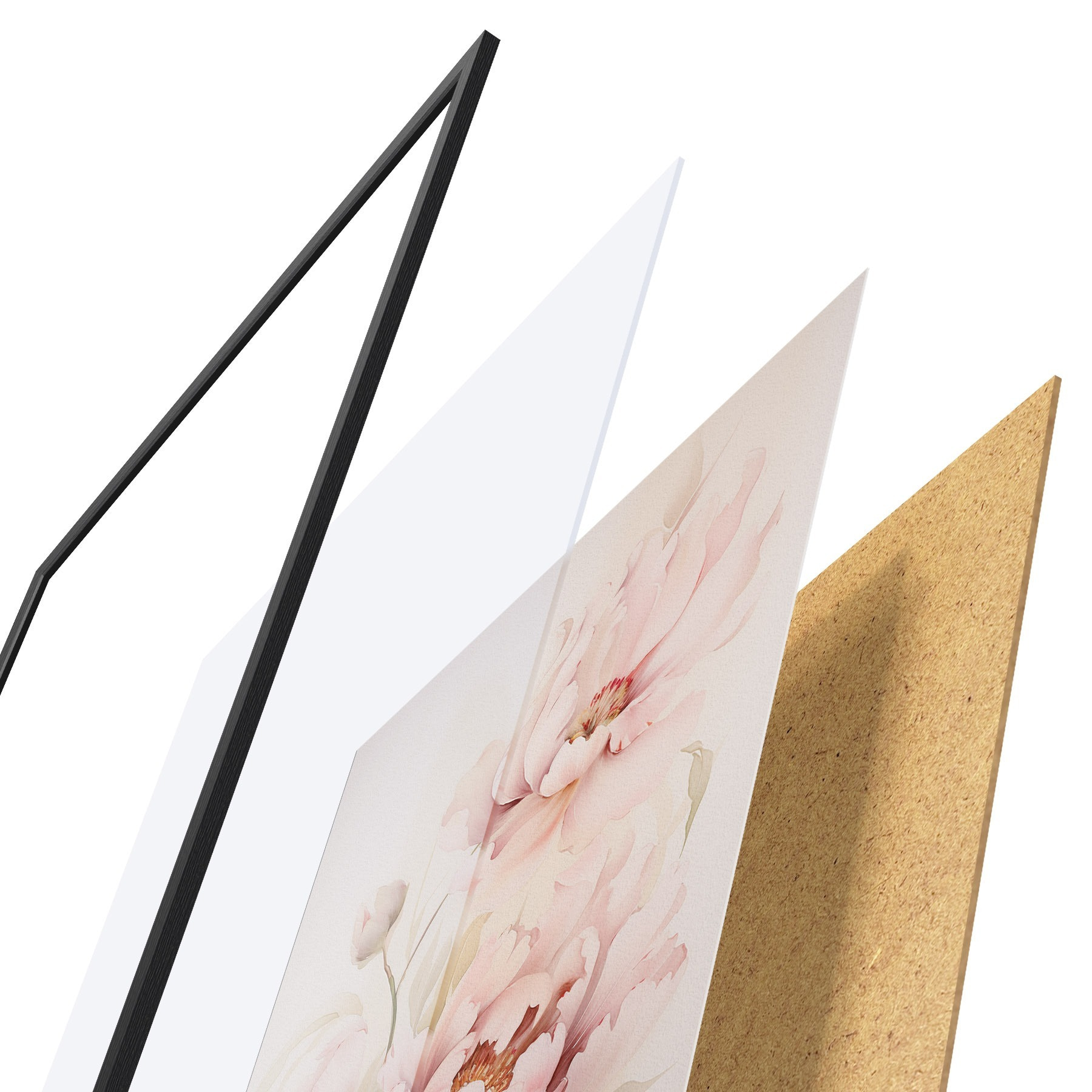 De poster bestaat uit een frame, plexiglas, geprinte afbeelding en spaanplaat achterkant. De poster kan meteen aan de muur worden gehangen dankzij de bevestigingen op de achterkant.
