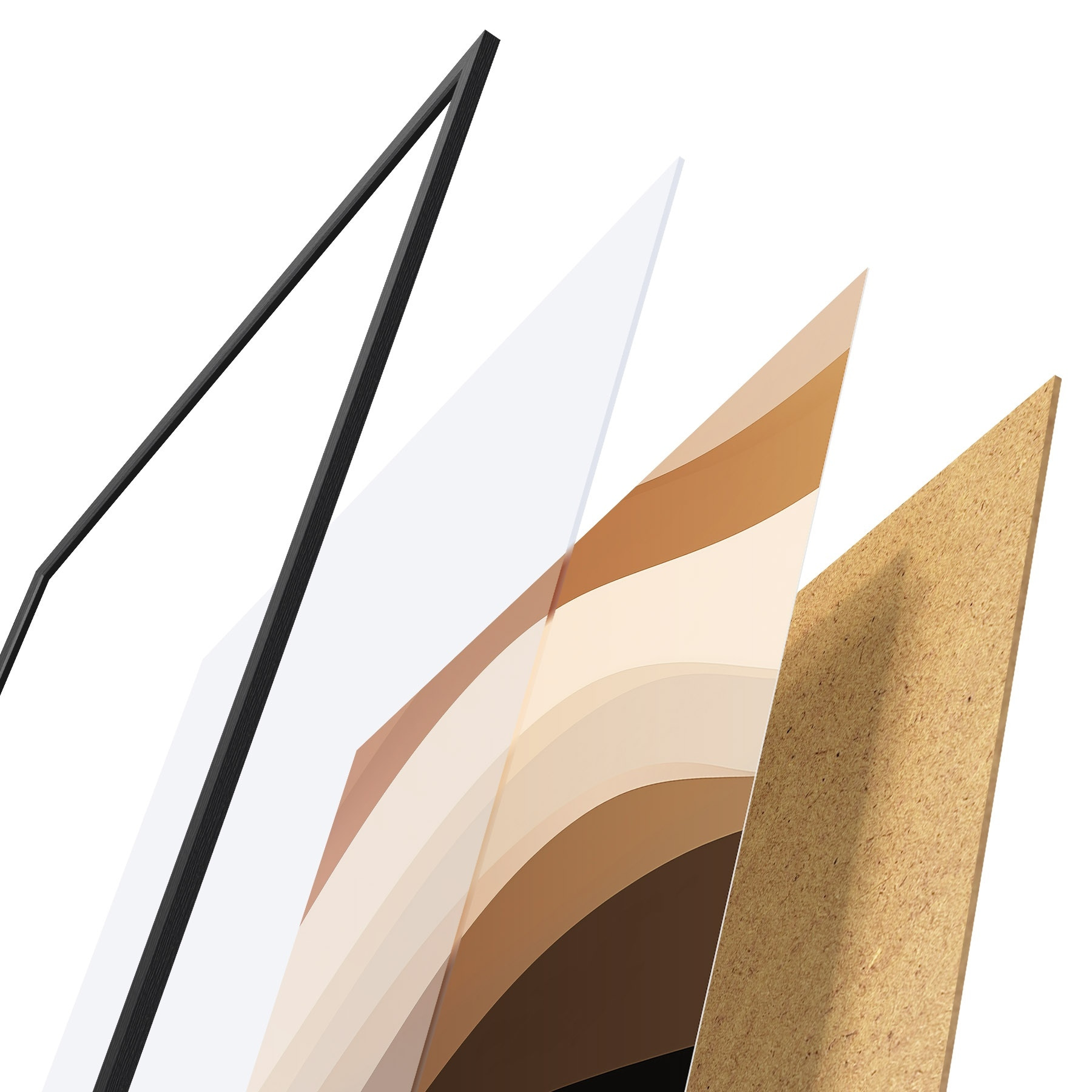 De poster bestaat uit een frame, plexiglas, geprinte afbeelding en spaanplaat achterkant. De poster kan meteen aan de muur worden gehangen dankzij de bevestigingen op de achterkant.