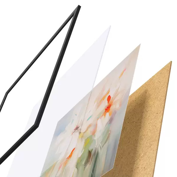 De poster bestaat uit een frame, plexiglas, geprinte afbeelding en spaanplaat achterkant. De poster kan meteen aan de muur worden gehangen dankzij de bevestigingen op de achterkant.