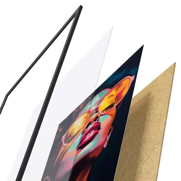 De poster bestaat uit een frame, plexiglas, geprinte afbeelding en spaanplaat achterkant. De poster kan meteen aan de muur worden gehangen dankzij de bevestigingen op de achterkant.