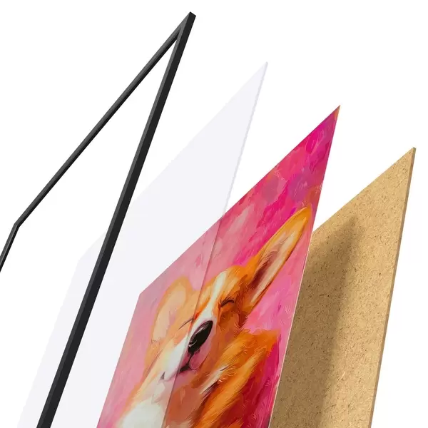 De poster bestaat uit een frame, plexiglas, geprinte afbeelding en spaanplaat achterkant. De poster kan meteen aan de muur worden gehangen dankzij de bevestigingen op de achterkant.