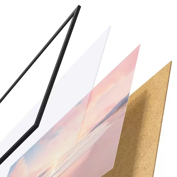 De poster bestaat uit een frame, plexiglas, geprinte afbeelding en spaanplaat achterkant. De poster kan meteen aan de muur worden gehangen dankzij de bevestigingen op de achterkant.