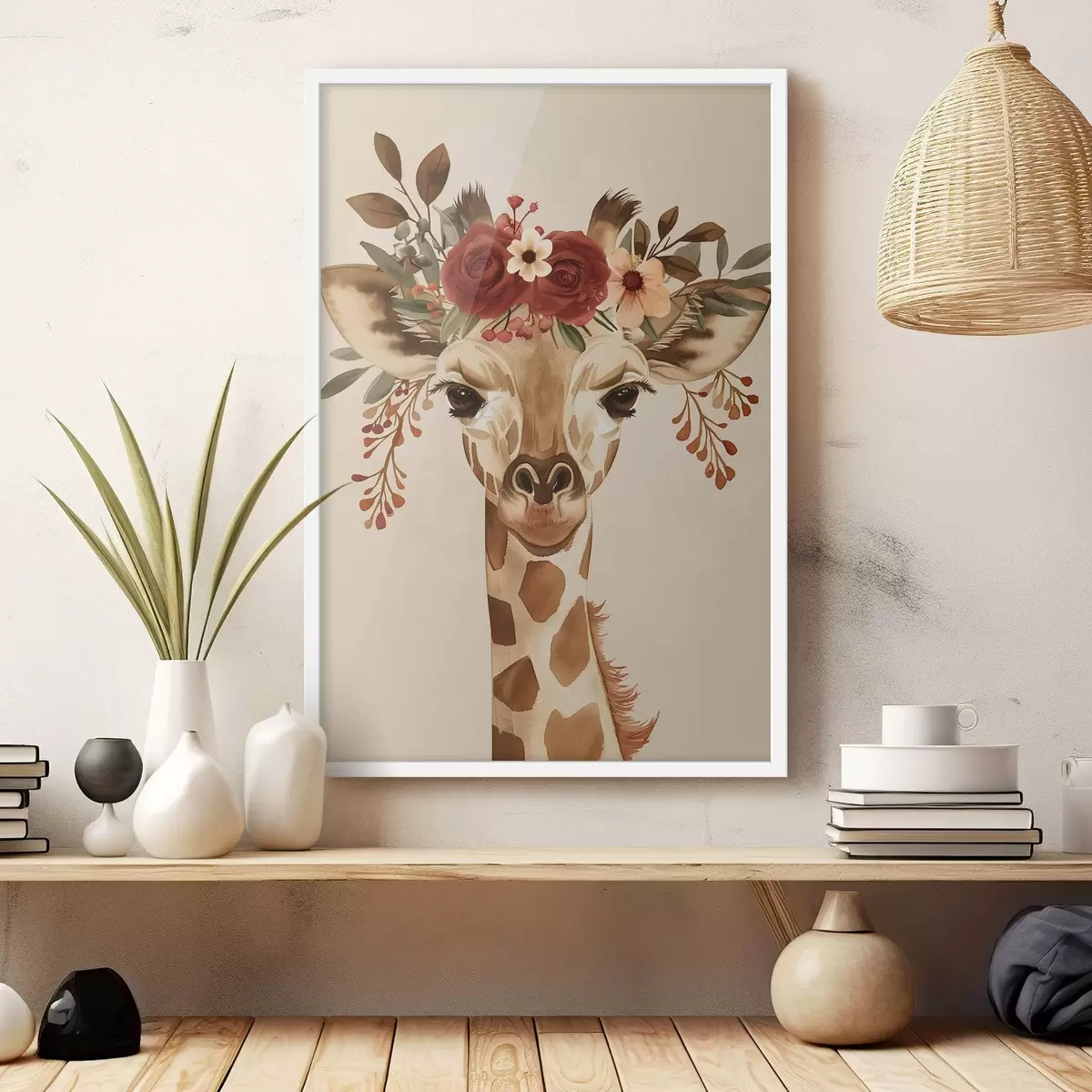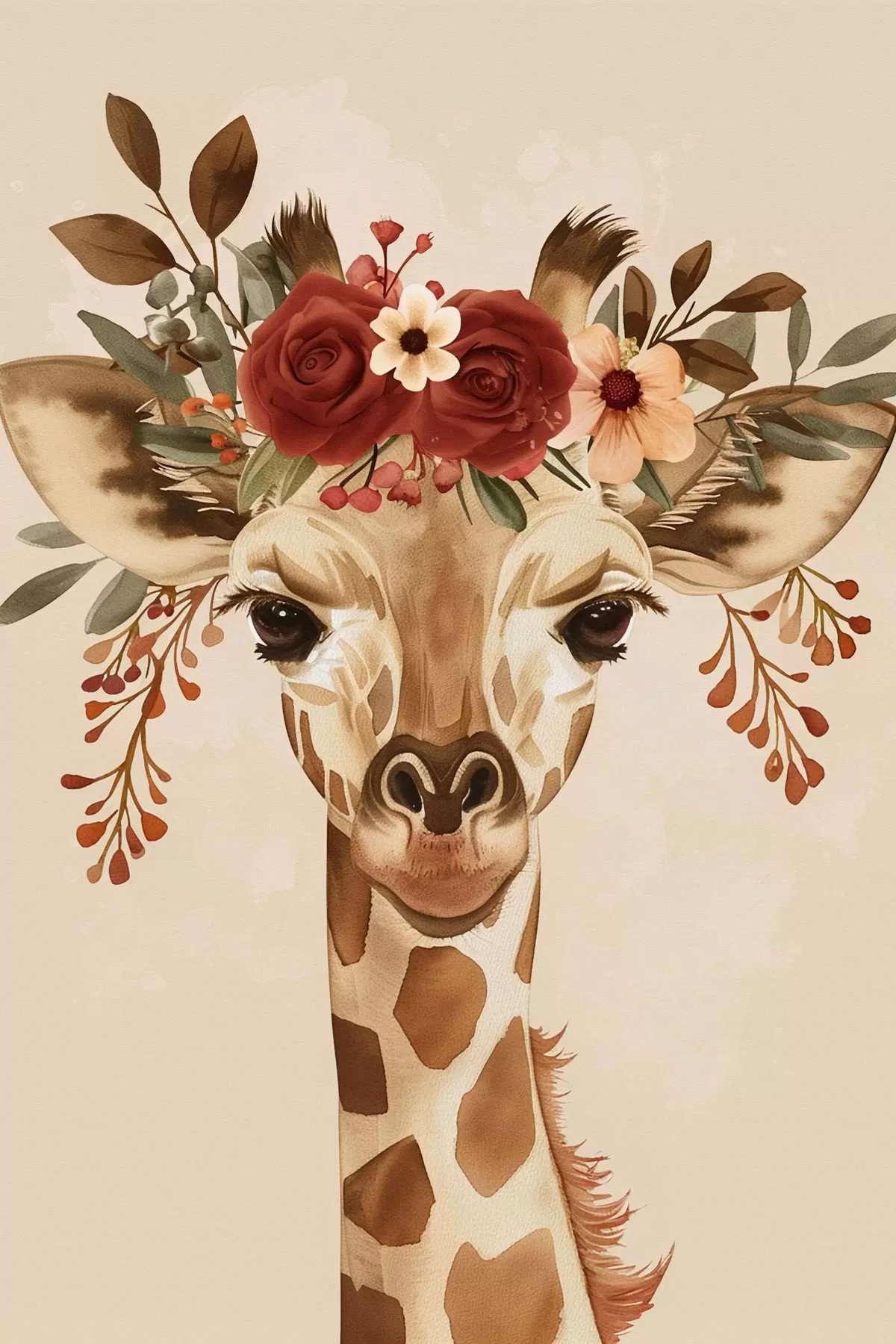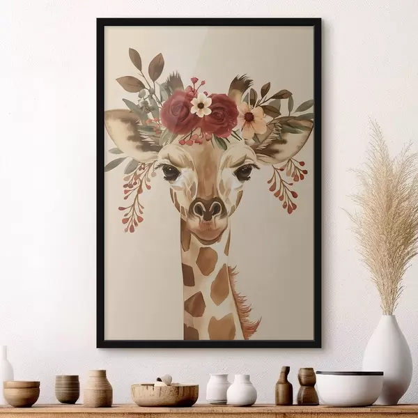 Poster Giraffe in aquarelstijl met bloemen op zijn hoofd Nr f45331